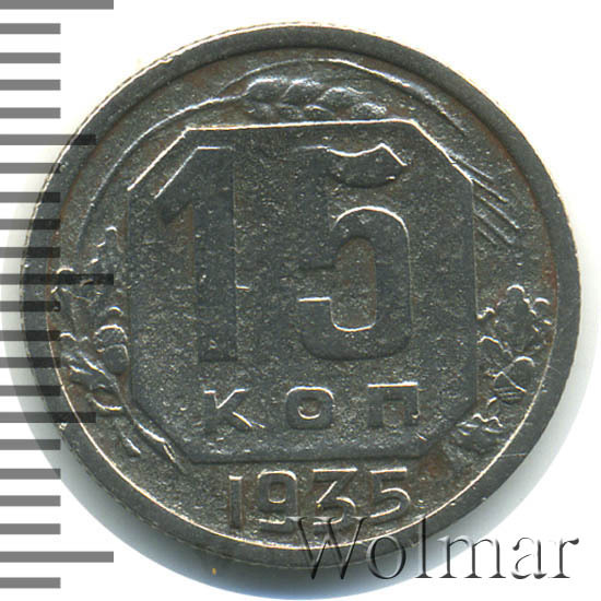 Первый год чеканки монет типа 1935 – 1946 годов преподнёс немало приятных сюрпризов собирателям разновидностей погодовки СССР. Так получилось и с 15 копеек 1935. Семь! вариантов по сочетаниям аверса и реверса. Наиболее востребованные и дорогие (оценка по каталогу Федорина А.И.): шт. 1.2 Б (600 дол. США), шт. 1.2 В R5 (1000$) и лицевая сторона штемпель 1.2(от 15 коп. 1931 г.) 5000$.Также есть новодельная монета специального чекана 50х годов. В обращении не встречается.