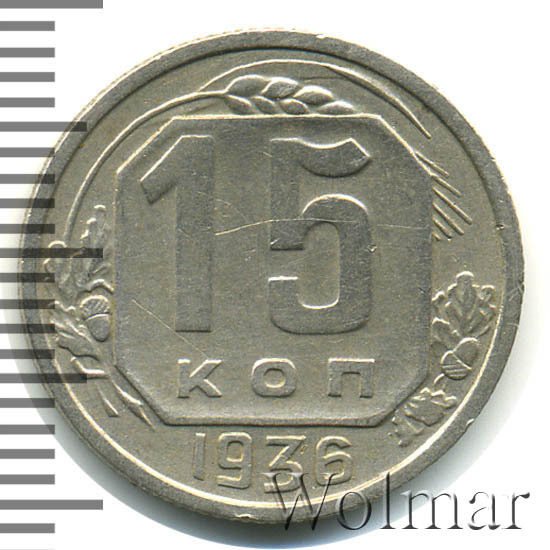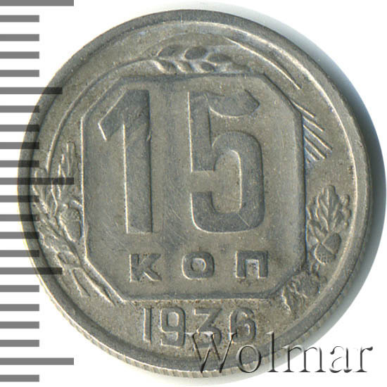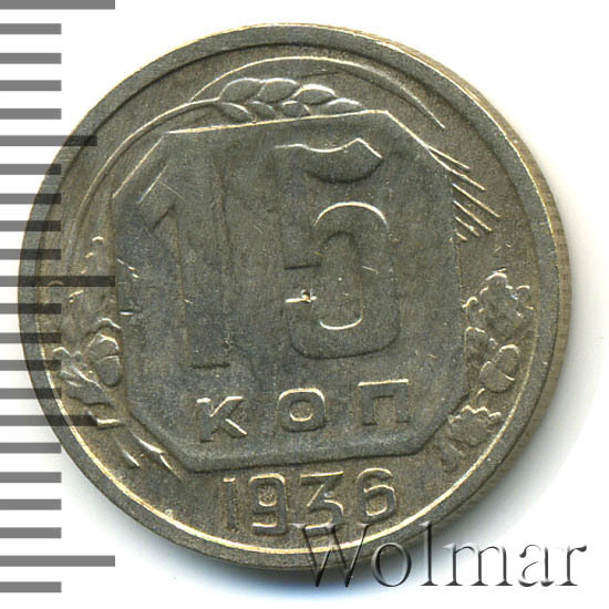 Цена на простую разновидность 15 копеек 1936 года не высока. Изменяется в сторону повышения только при наличии превосходного состояния монеты.