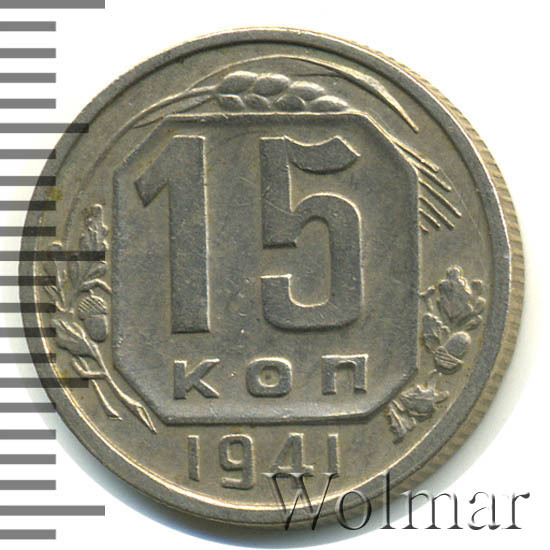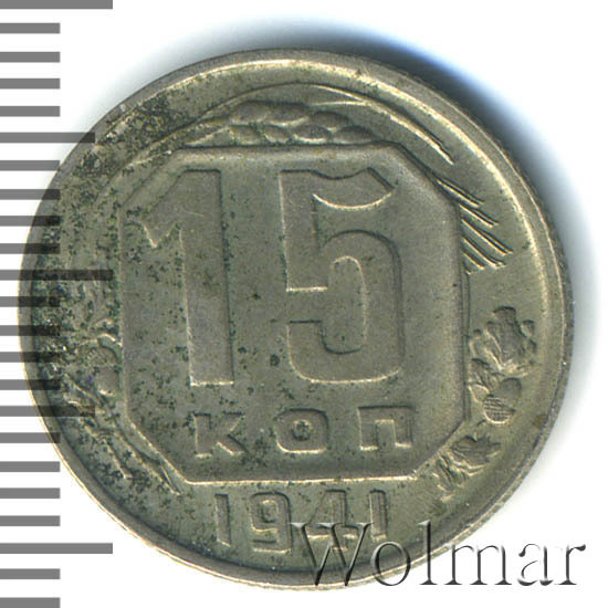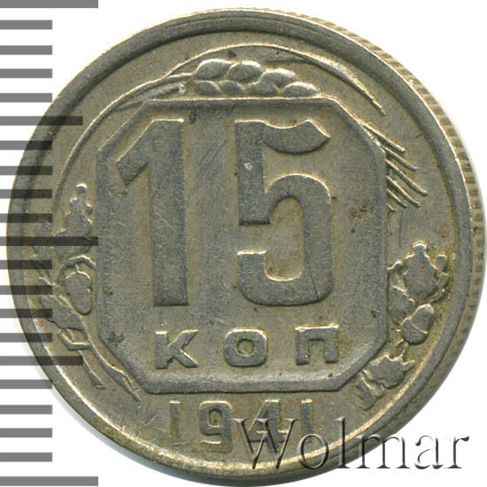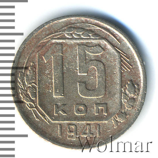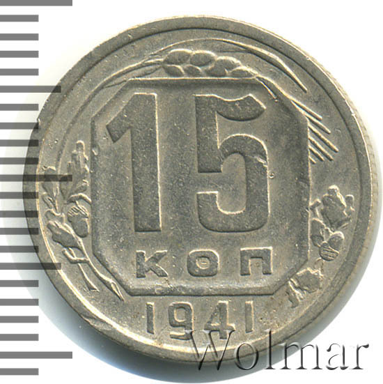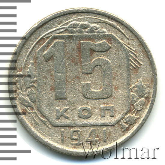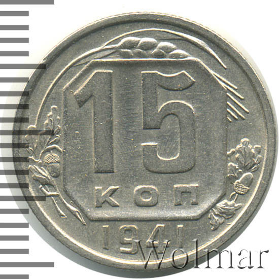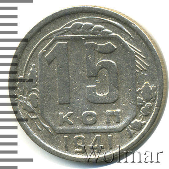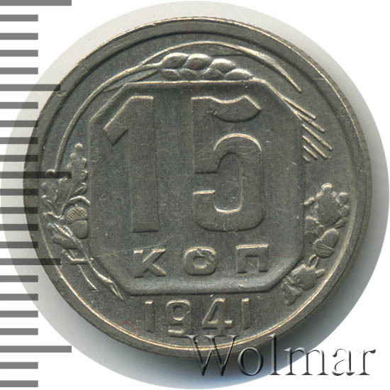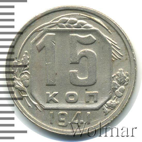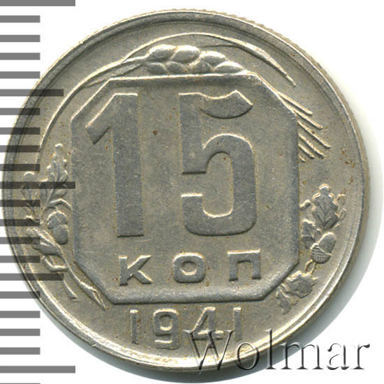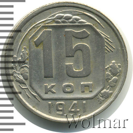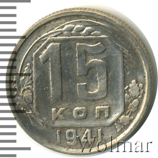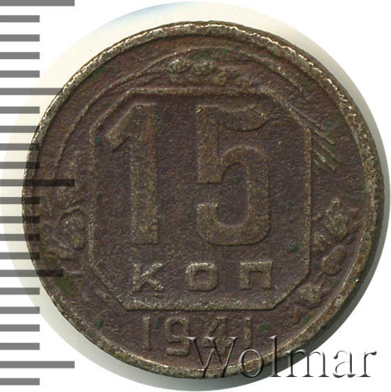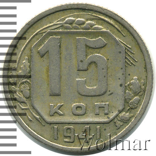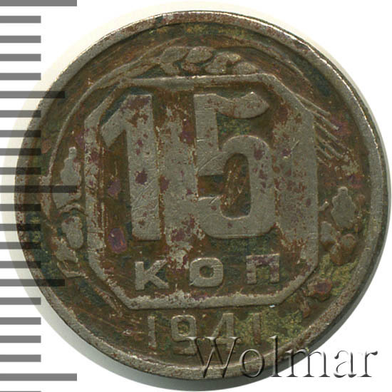 15 копеек 1941 частая монета. Чеканились на Ленинградском монетном дворе по геометрическим и весовым стандартам типа 1935 – 1946 гг. Материал изготовления – никелевый сплав (мельхиор). Разновидностей не имеет. Стоимость зависит от состояния.