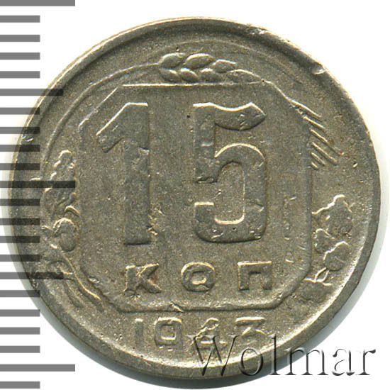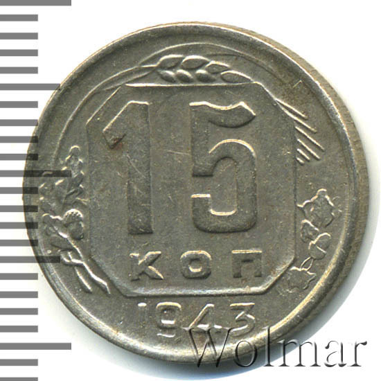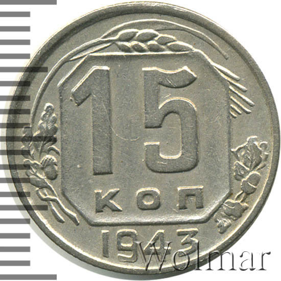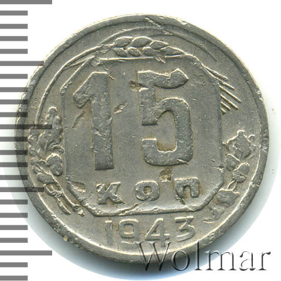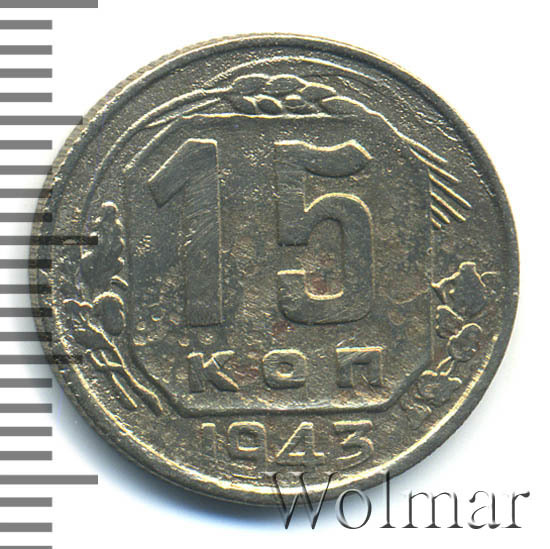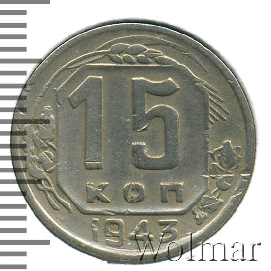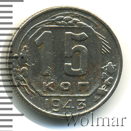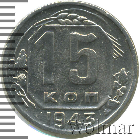 15 коп. 1943 г. выпускались из немагнитного никелевого сплава, белого цвета. Тип 1937 – 1946 гг. (одиннадцать связующих лент в гербе). Расположение аверса к реверсу – медальное. Тираж доподлинно не известен. Штемпельных разновидностей – десять (см. описанние аверса и реверса). Самые интересные и дорогие из них: шт. 1.1"Д" (R1). С этим же аверсом, но с обороткой "Е" (R5) и, с такой же степенью редкости, вариант 15 коп. 1943 г. с лицевой стороной 2 и оборотной шт. "В".