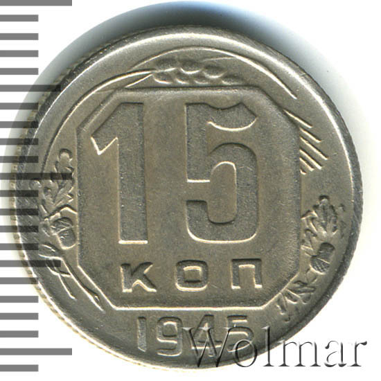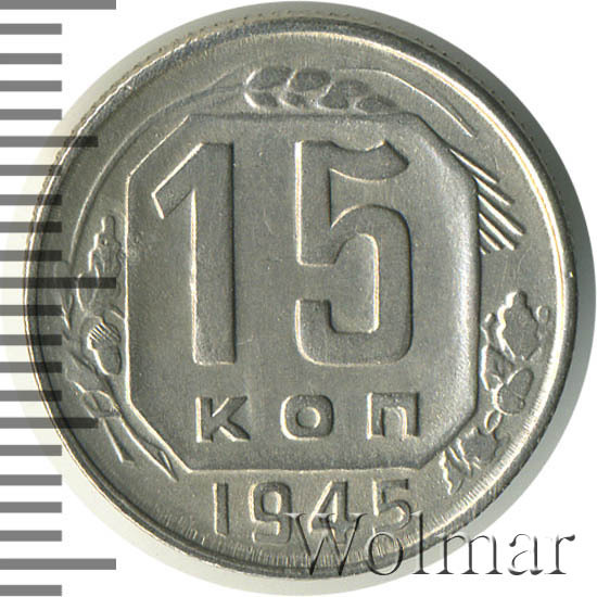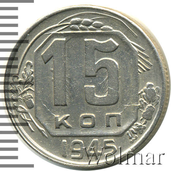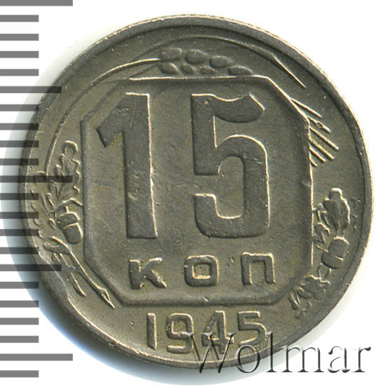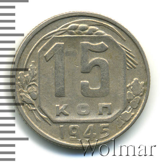 Реверс монеты 15 копеек 1945 года