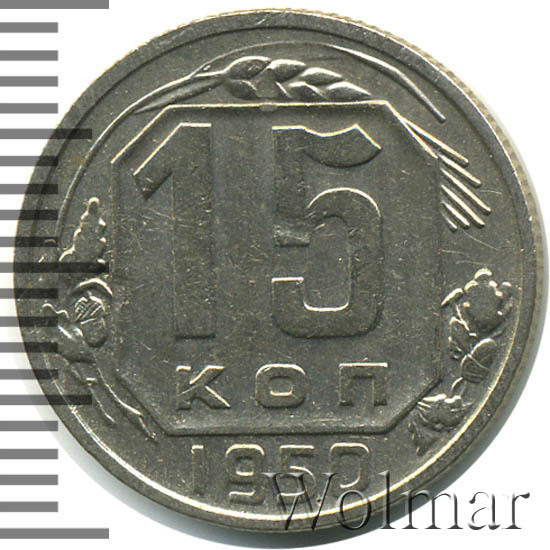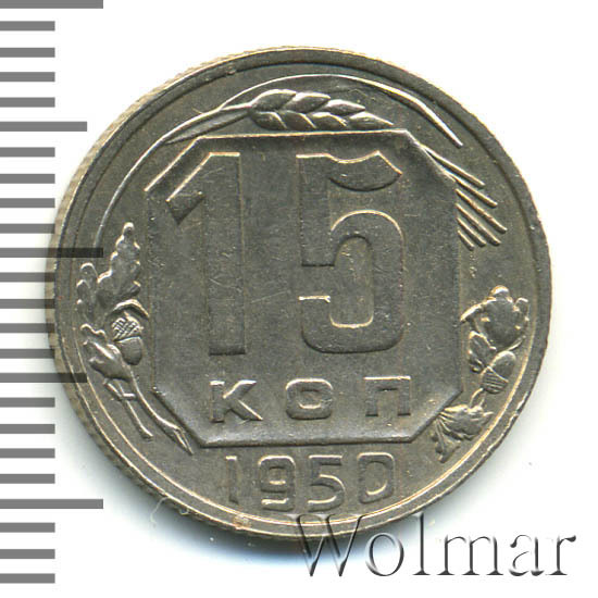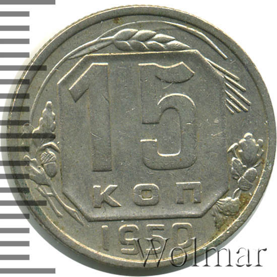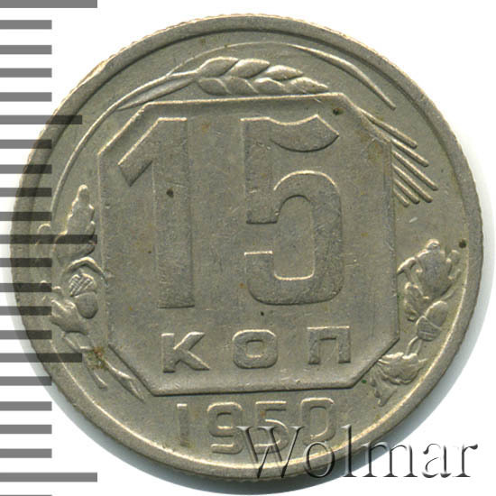 Очень массовая монета, поэтому стоимость монеты 15 копеек 1950 года не велика. Известна монета специального чекана (новодельный чекан 50-х годов), шт.3.22 (Ф№109Н), которая оценивается каталогом Федорина (2013) в 1000 уе. Интересно, что в регулярном обращении аналог данной монеты отсутствовал.