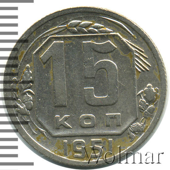 Реверс монеты 15 копеек 1951 года