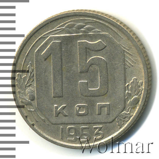 Монета, номиналом в 15 копеек для денежного обращения Союза Советских Социалистических Республик. Отчеканена, как и все номиналы 1953 года, на Ленинградском монетном дворе (ныне СПМД, г. Санкт – Петербург). Медальная (0 градусов) соостность сторон. Изготовлена из немагнитного никелевого сплава - мельхиор, белого цвета. Официальных данных о тираже нет. Геометрические и весовые параметры пятнадцатикопеечных монет образца 1948 – 1957 гг. Цена 15 копеек 1953 г. не значительна на монеты средней сохранности. В высоком качестве (без следов хождения, в штемпельном блеске) отличается в большую сторону в несколько раз.