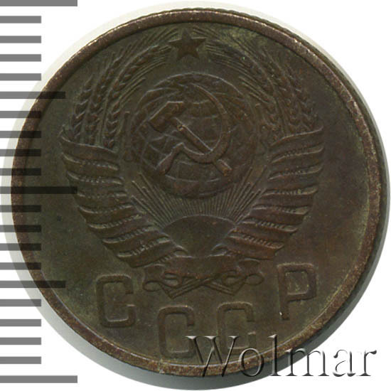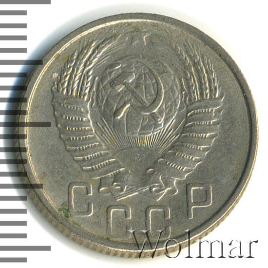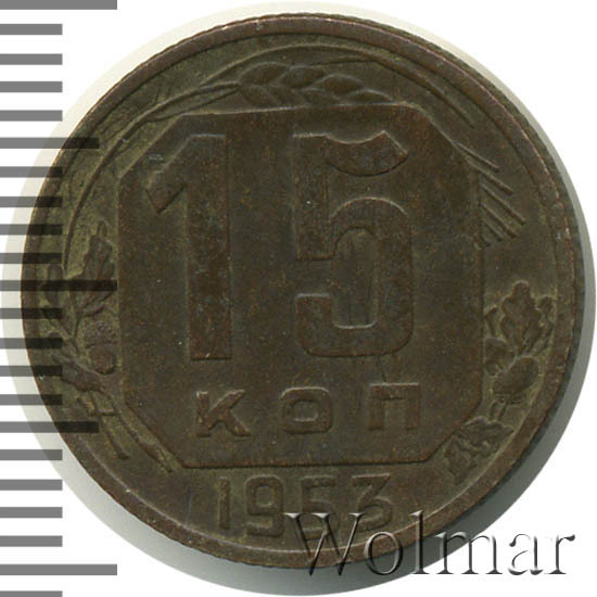 Известных штемпельных разновидностей – пять (см. описание реверса). Самая редкая из них – штемпель 3.21"А". Стоимость, этого разновида, более чем в 150 раз превосходит цену остальных разновидностей 15 копеек 1953 года. Более подробно ознакомиться со стоимостью 15 копеек 1953 года, Вы можете во вкладке «стоимость монет», а так же принять участие в текущих аукционах, пройдя по вкладке «активные лоты».