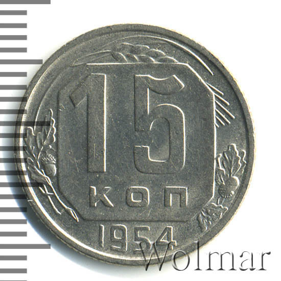 15 копеек 1954 года, часто встречается в отличном коллекционном состоянии (без следов пребывания в обороте), от этого цена 15 коп. 1954 не высока. Более подробно ознакомиться со стоимостью 15 копеек 1954 года, Вы можете во вкладке «стоимость монет», а так же принять участие в текущих аукционах, пройдя по вкладке «активные лоты».