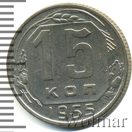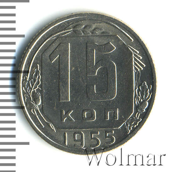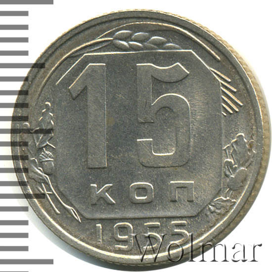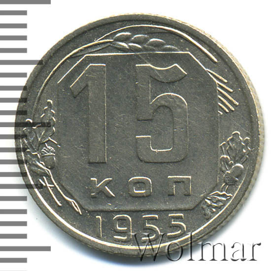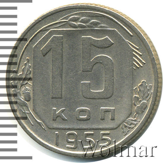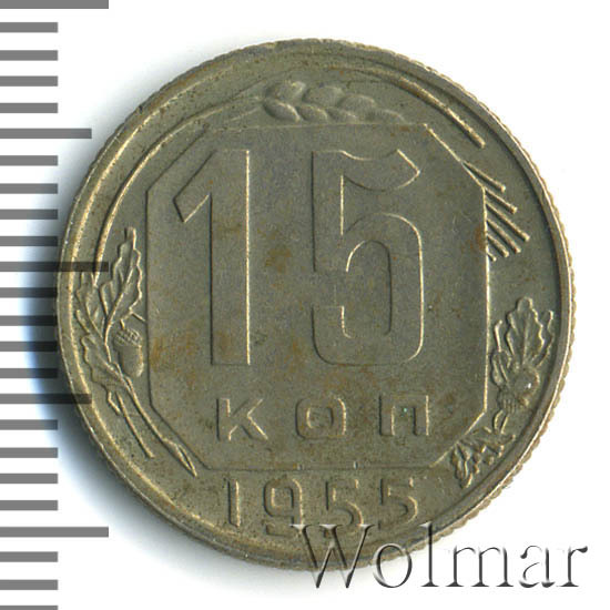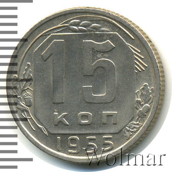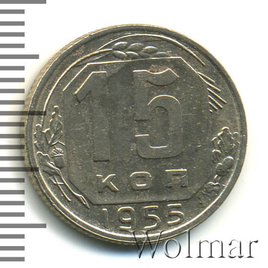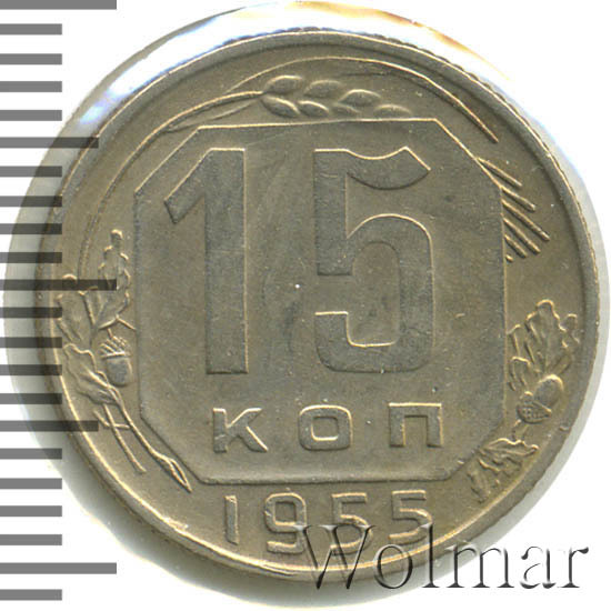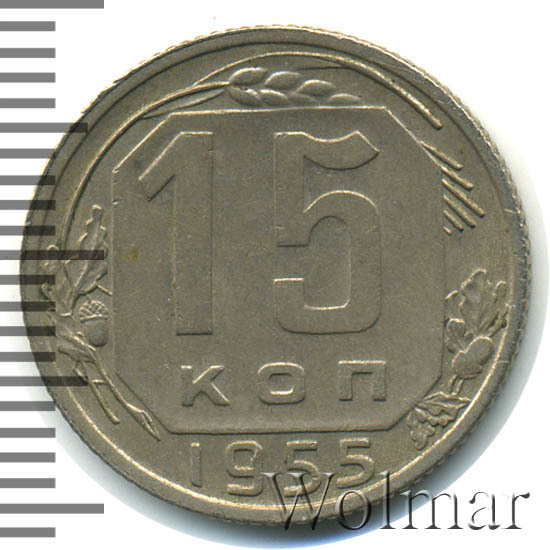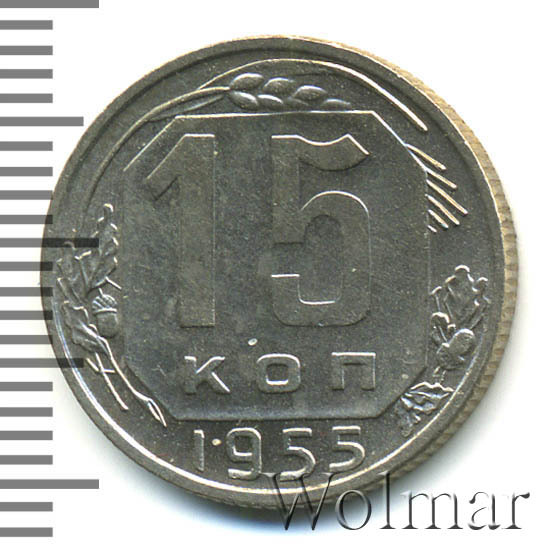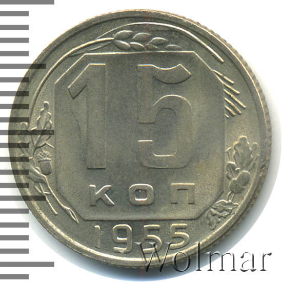 15 копеек в 1955 году чеканились из мельхиора - немагнитного сплава белого цвета. Оформление было традиционно для монет этого достоинства, на реверсе щиток с цифрами номинала, под ним год выпуска, на аверсе герб СССР с 16 витками связующей пшеничные колосья ленты. Известны две штемпельные разновидности 15 копеек, отличающиеся друг от друга немного в цене. Чуть дороже считается шт. 3.21, отличающийся тем, что на аверсе, около правого луча звезды из ближнего зерна не выходит остей. Стоимость у 15 копеек 1955 года не большая, даже у более редкого штампа цена едва ли превышает стоимость простой монетки в 7-8 раз.