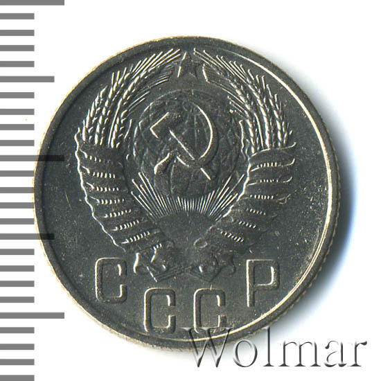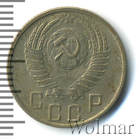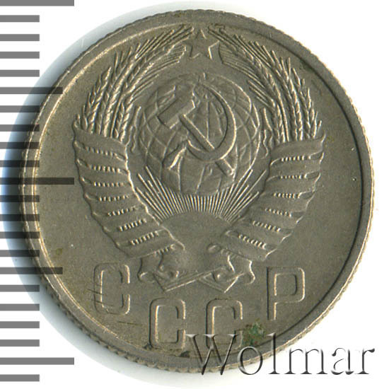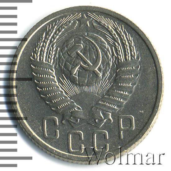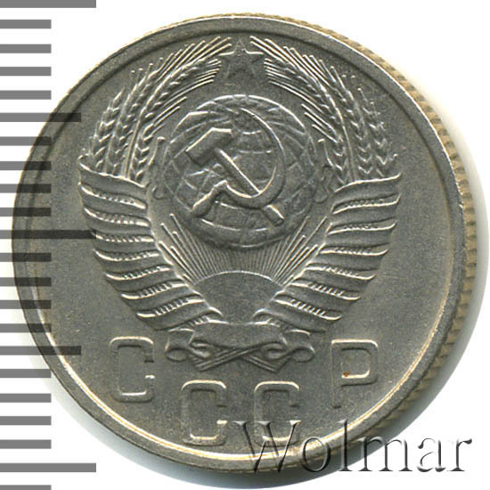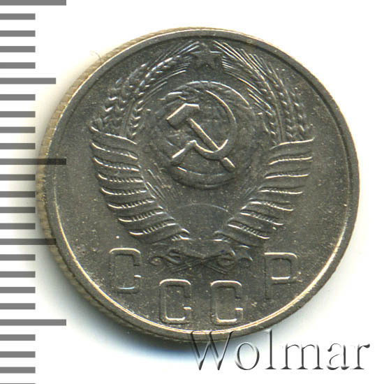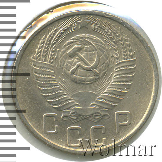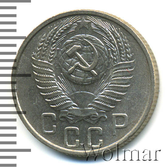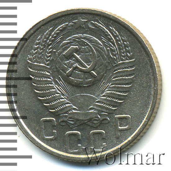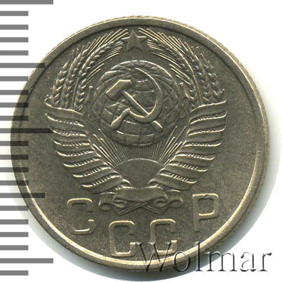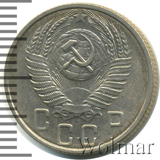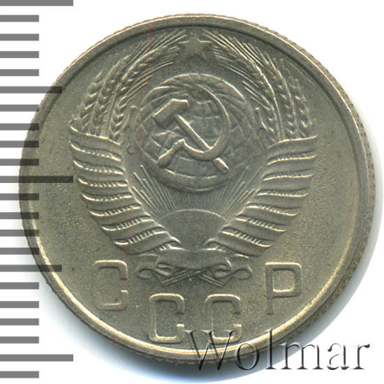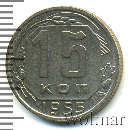 15 копеек в 1955 году чеканились из мельхиора - немагнитного сплава белого цвета. Оформление было традиционно для монет этого достоинства, на реверсе щиток с цифрами номинала, под ним год выпуска, на аверсе герб СССР с 16 витками связующей пшеничные колосья ленты. Известны две штемпельные разновидности 15 копеек, отличающиеся друг от друга немного в цене. Чуть дороже считается шт. 3.21, отличающийся тем, что на аверсе, около правого луча звезды из ближнего зерна не выходит остей. Стоимость у 15 копеек 1955 года не большая, даже у более редкого штампа цена едва ли превышает стоимость простой монетки в 7-8 раз.