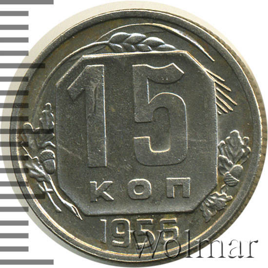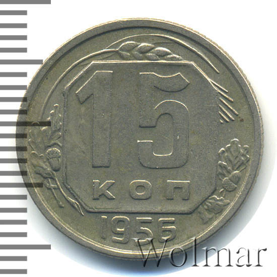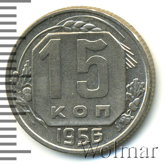 15 копеек 1956 г. – разменная монета для денежного обращения Советского Союза. Тип 1948 – 1957 гг. Последний год чеканки с данным дизайном аверса (шестнадцать витков связующей ленты в Государственном Гербе СССР). В 1956 году было выпущено в обращение семь номиналов разменных монет (от одной до двадцати копеек). Чеканка производилась на Ленинградском монетном дворе – ЛМД (ныне СПМД, г. Санкт – Петербург). Материал изготовления: немагнитный никелевый сплав – мельхиор, белого цвета. Отношение лицевой стороны к оборотной – медальное, как у всех монет советского периода. Известных штемпельных разновидностей две (см. описание сторон). Пятнадцать коп. с оборотной стороной "А" дороже в 100 и более раз (в зависимости от состояния) второго разновида с реверсом "Б".