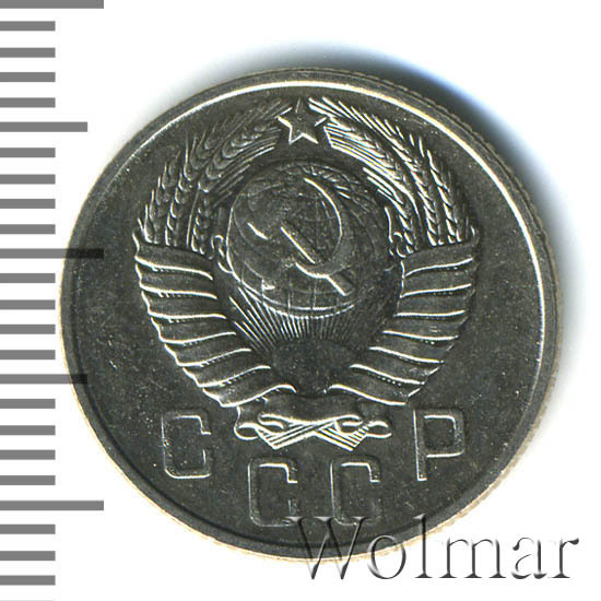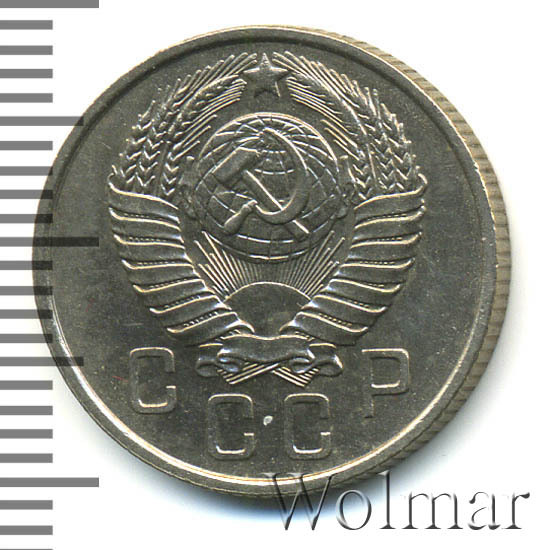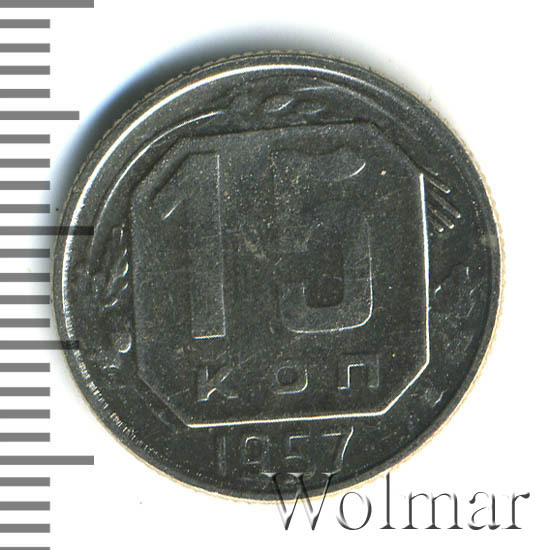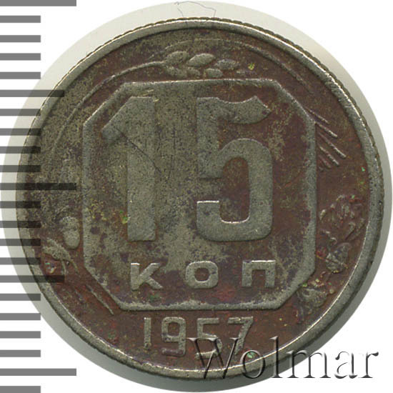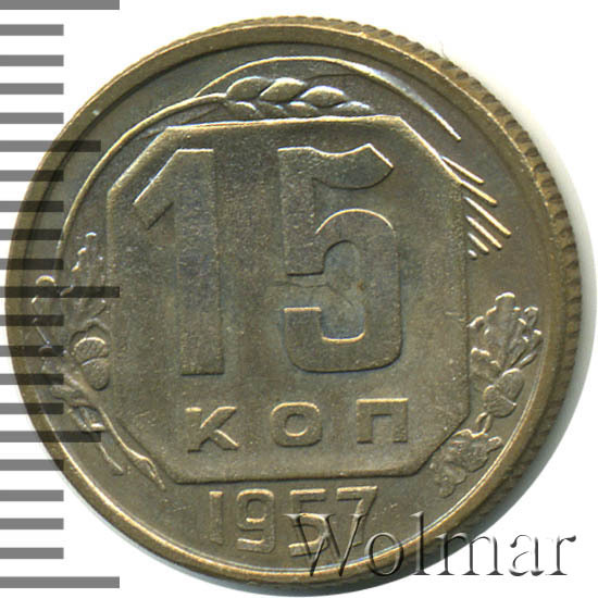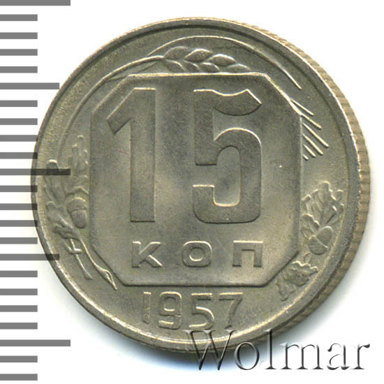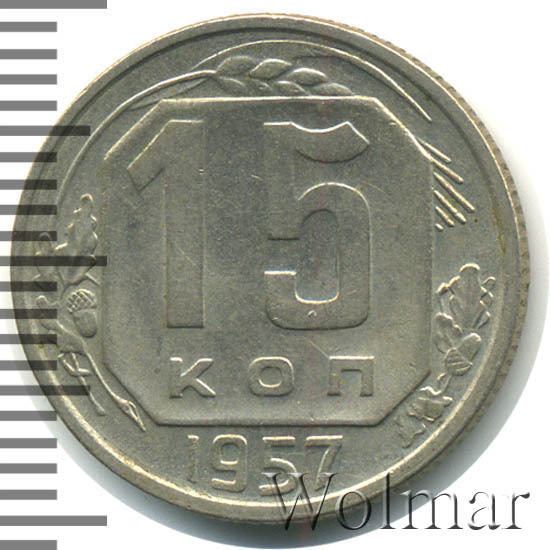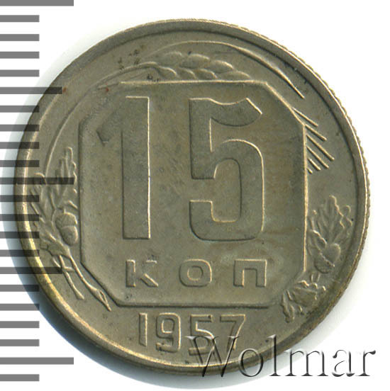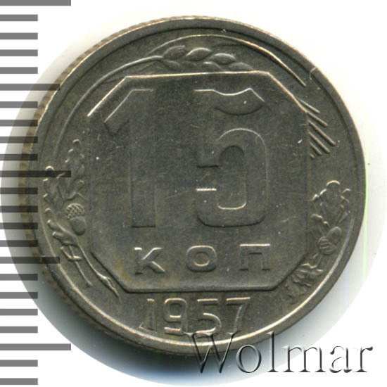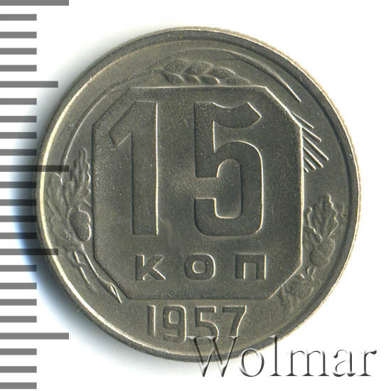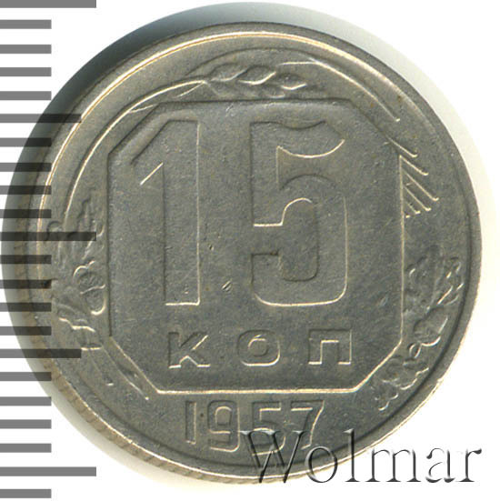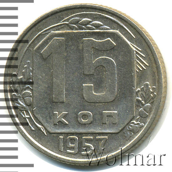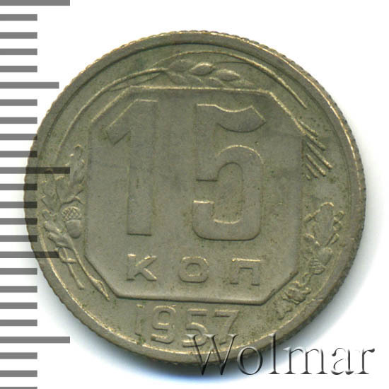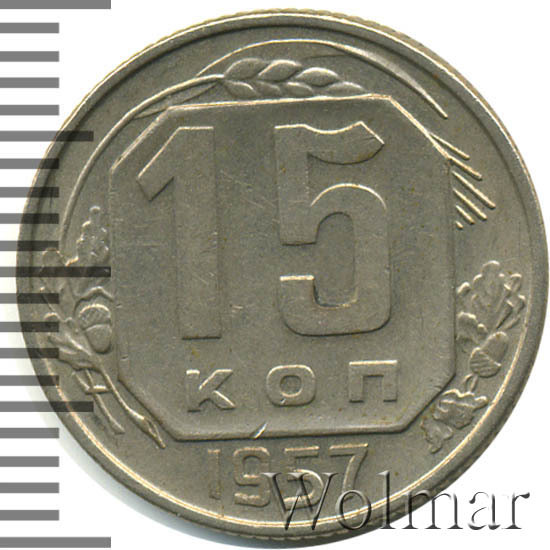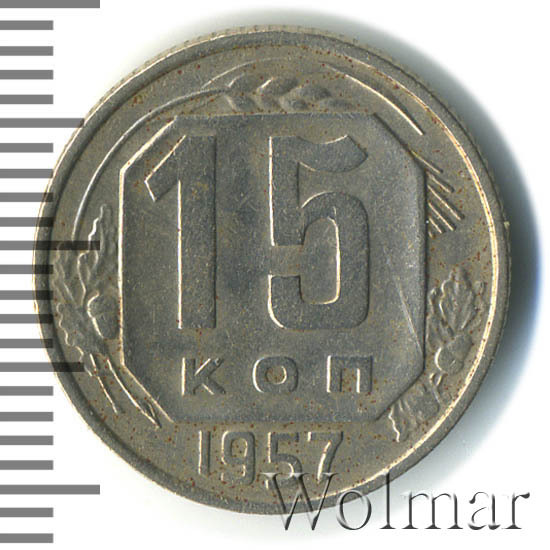 15 копеек 1957 года чеканили из мельхиора, в гербе СССР 15 витков ленты, как и у медно-никелевых монет после реформы 1961. У похожих монет 1956 и ранее было 16 витков ленты, связано это с тем, что летом 1956 Карело-Финская ССР была преобразована в автономию в составе РСФСР, и 16-ая лента с девизом на финском была убрана с герба государства.