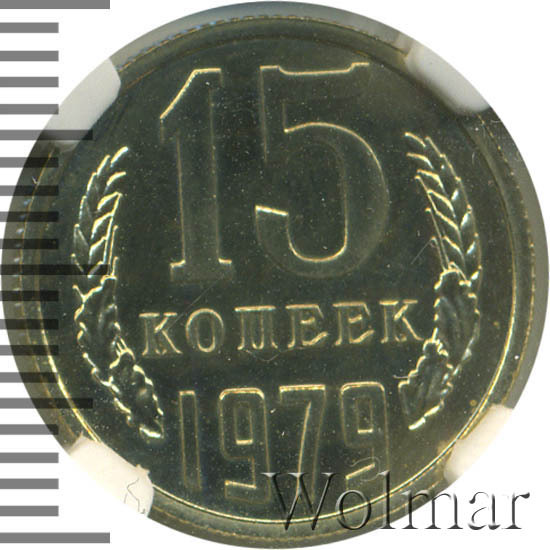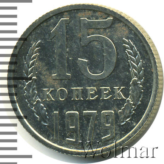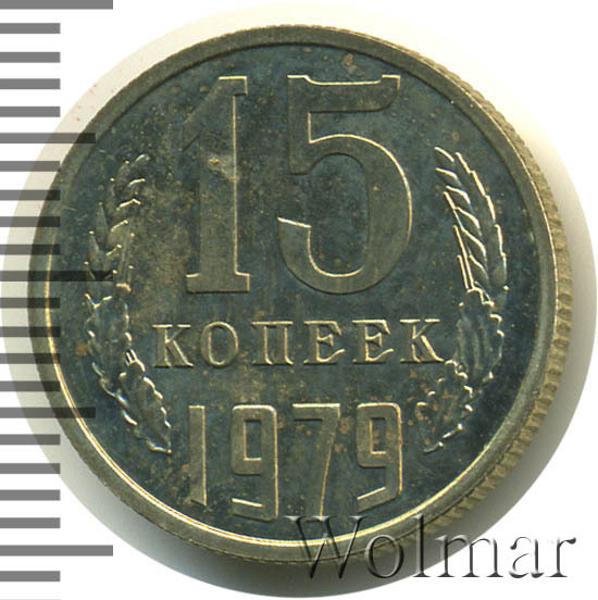 Тиражная монета для денежного оборота СССР. Тираж 15 копеек 1979 года огромен, поэтому цена на эту монетку, даже в высоком состоянии, минимальна. Изготовлена монета из медно - никелевого сплава, белого цвета. В плане разновидностей, монета ни чем не примечательна (см. описание аверса и реверса).