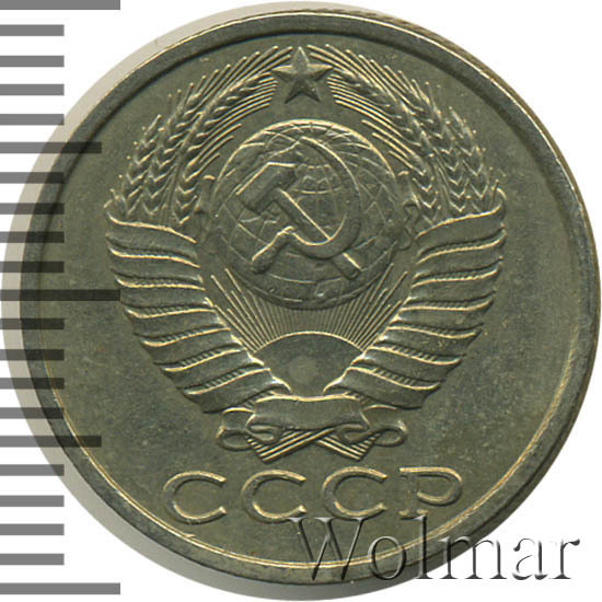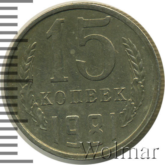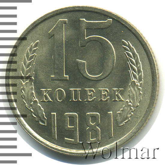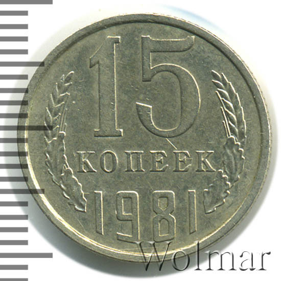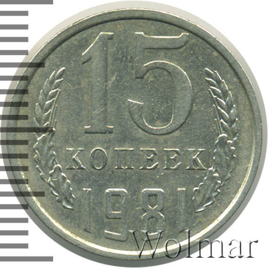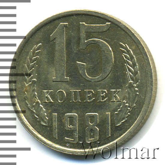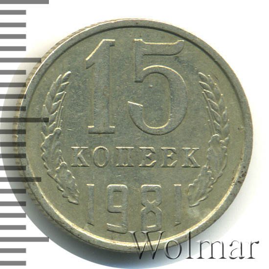 Выше представлены медно-никелевые немагнитные 15 копеек 1981 года. Эта вполне обычная тиражная монетка встречается довольно часто, для коллекции может быть интересна только в штемпельном блеске, в идеальном состоянии. Известна более редкая разновидность, оцениваемая в несколько раз дороже, отличается только лишь остями вторых колосьев в гербе Советского Союза.
