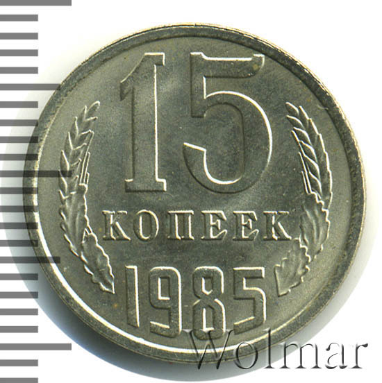 Рядовая, монета номиналом в пятнадцать копеек, образца 1961 -1991 гг. Типичная монета, которая встречается во всех коллекциях. Отчеканена на Ленинградском монетном дворе, очень большим тиражом, от того, цена на неё не велика, даже для монет в отличной сохранности (без следов хождения, в штемпельном блеске царапин, забоин и пятен). Один из девяти номиналов, отчеканенных в восемьдесят пятом году. Соосность аверса к реверсу 0 градусов (медальная). Медно – никелевый сплав (нейзильбер), немагнитный, белого цвета.