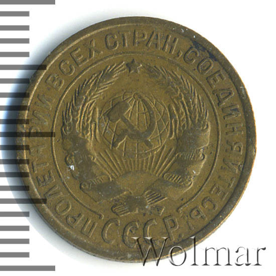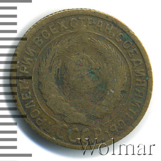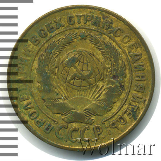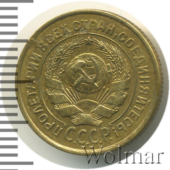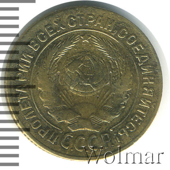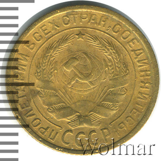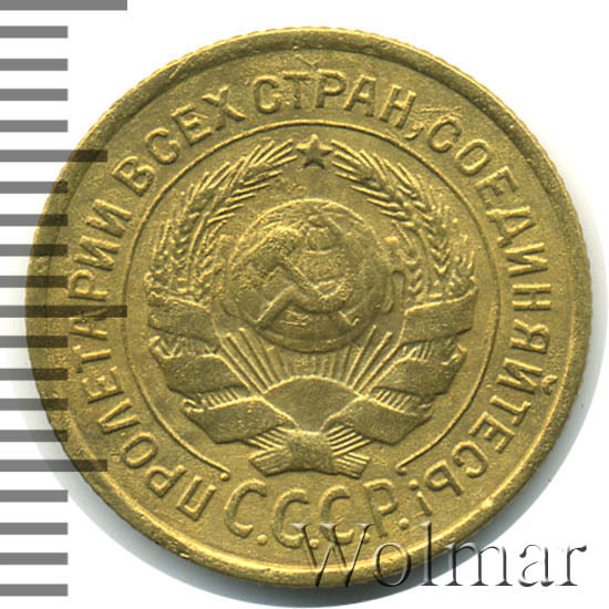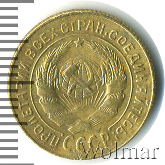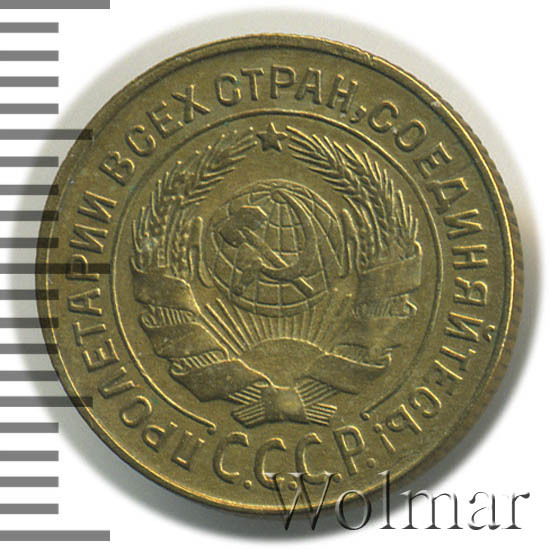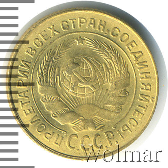 Штемпель 1.1. круговая надпись удалена от выступающего канта монеты, острие серпа расположено выше полюса, герб СССР - 7 витков