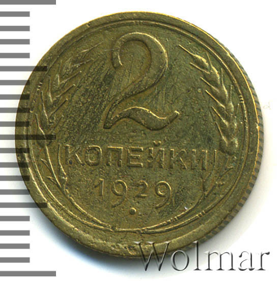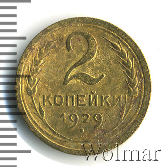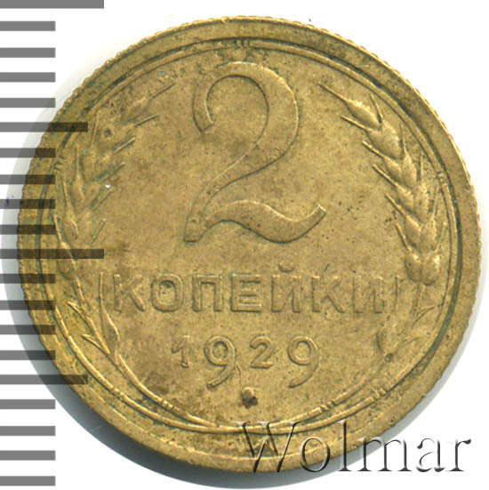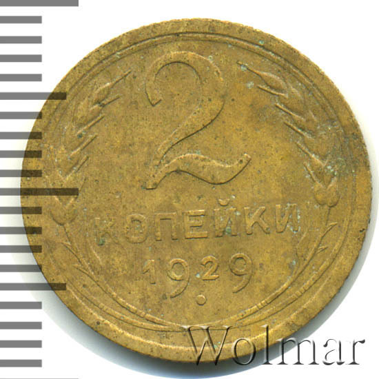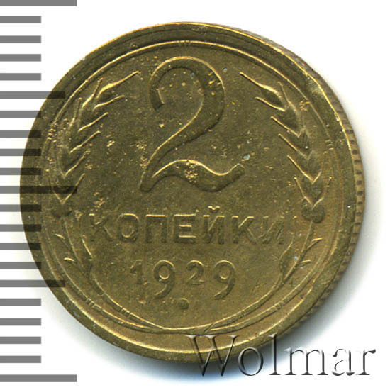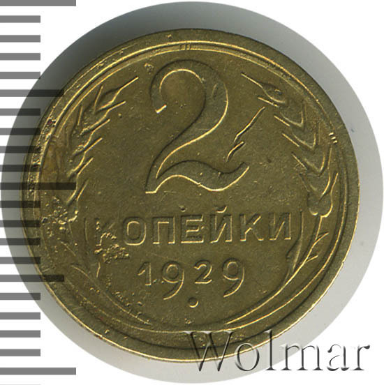 Две копейки 1929 г. тиражная монета. Один из 7 номиналов (от 1 до 20 копеек) выпущенных в денежное обращение Советского Союза в двадцать девятом году. Бронзовые двухкопеечные монеты чеканились на ЛМД (Ленинградском монетном дворе) по геометрическим и весовым стандартам типа 1926 – 1935 гг. Чеканка велась из немагнитного сплава алюминиевой бронзы, жёлтого цвета. Отношение гербовой стороны и оборотной – медальное (0 градусов). Тираж: 80000 тысяч штук. Представляют нумизматический интерес в состоянии не ниже среднего, в высоком качестве UNC, цена на две копейки 1929 г. может возрасти в несколько раз.