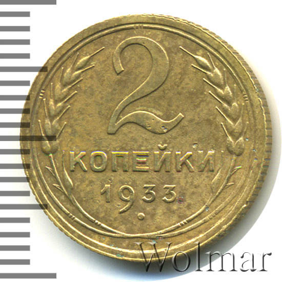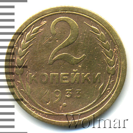 Чеканка Ленинградского монетного двора. Тип 1926 – 1935 гг. Тираж: 54873 тысяч штук. Известных штемпельных разновидностей нет (см. описание аверса и реверса). В пятидесятых годах прошлого века, был произведён специальный чекан 2 коп. 1933 г., с аверсом шт. 1.2 (Ф№22Н). Цена новодела в 50 раз превышает стоимость стародельной монеты. Более подробно ознакомиться с ценой 2 копеек 1933 года, Вы можете во вкладке «стоимость монет», а так же принять участие в текущих интернет - аукционах, пройдя по вкладке «активные лоты».