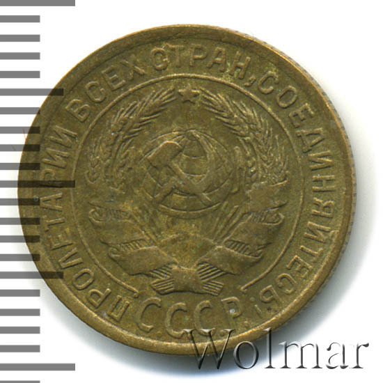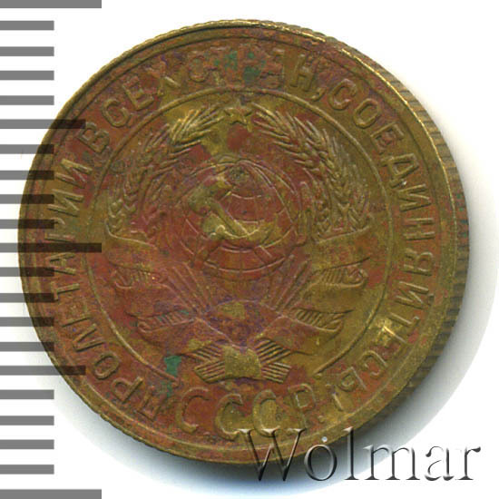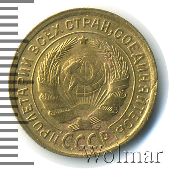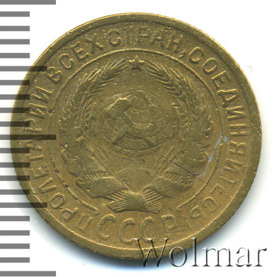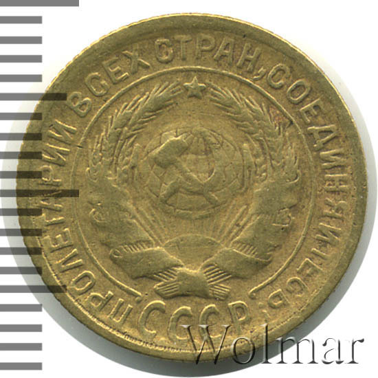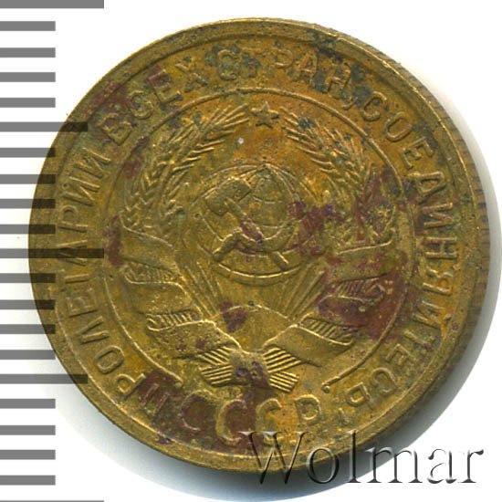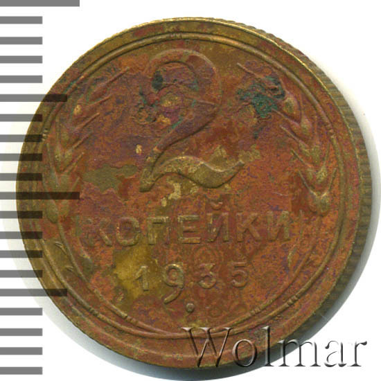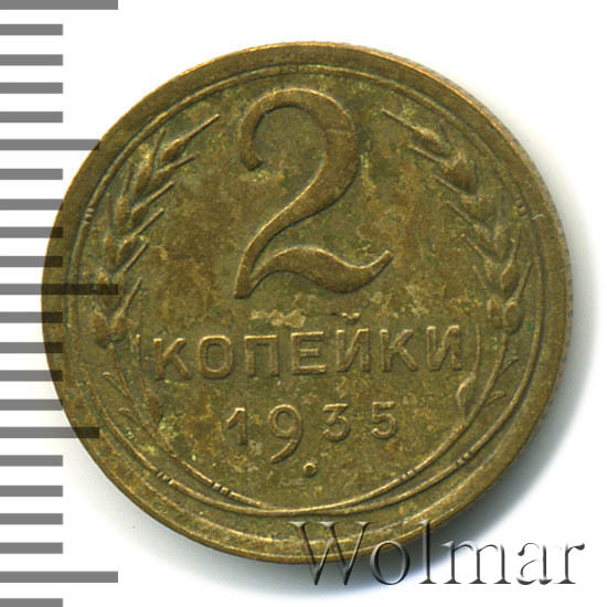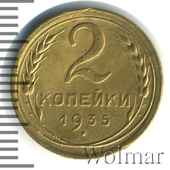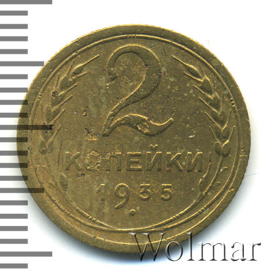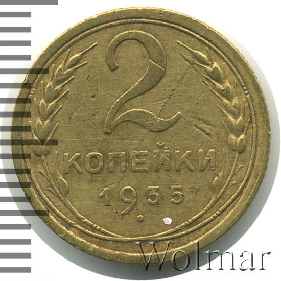 В 1935 госбанк СССР выпускает двух копеечные монеты с двумя разными типами лицевой стороны. Выше представлена двушка со старым типом аверса, по кругу государственного герба расположена надпись с лозунгом: "пролетарии всех стран соединяйтесь", буквы СССР снизу не большие, овальной формы. Для старого типа аверса выделяют три штемпельные разновидности, разнящиеся вариантами расположения узелков стебельного ободка, либо вообще их отсутствием.