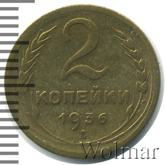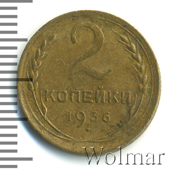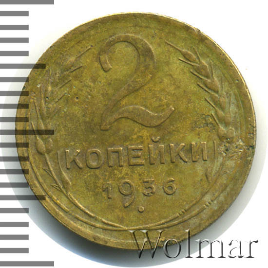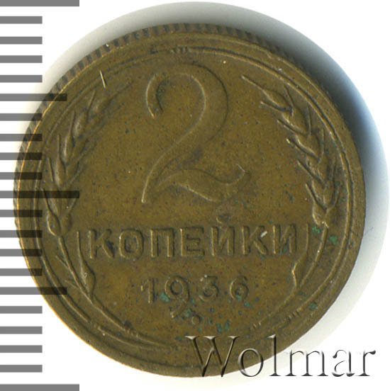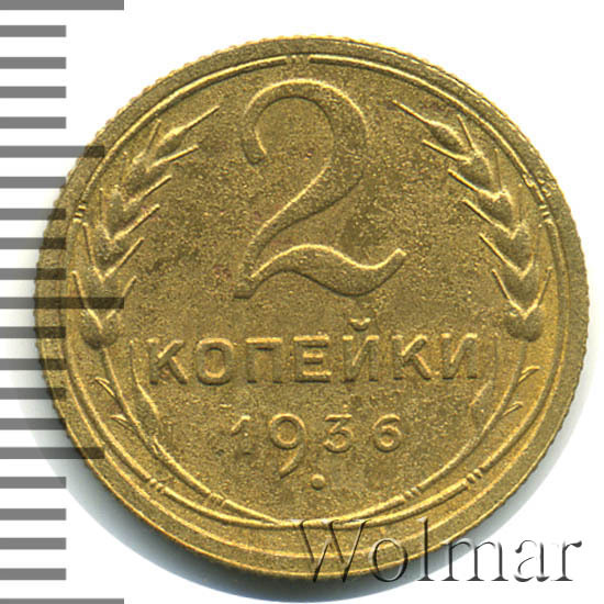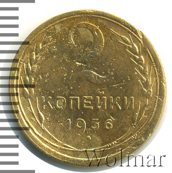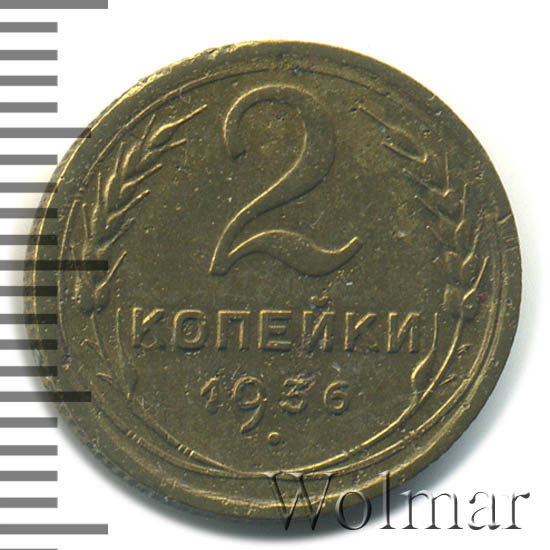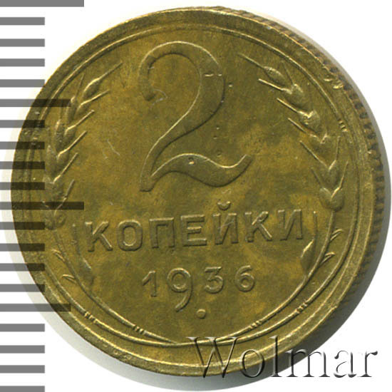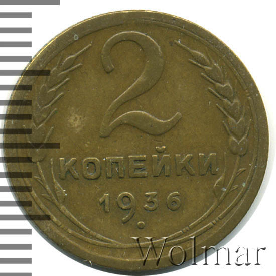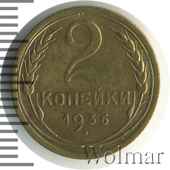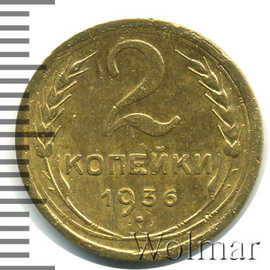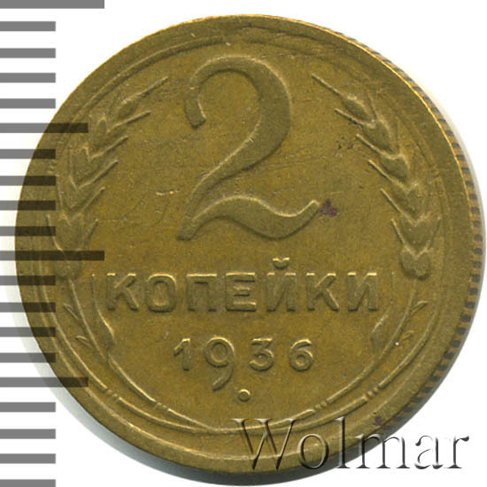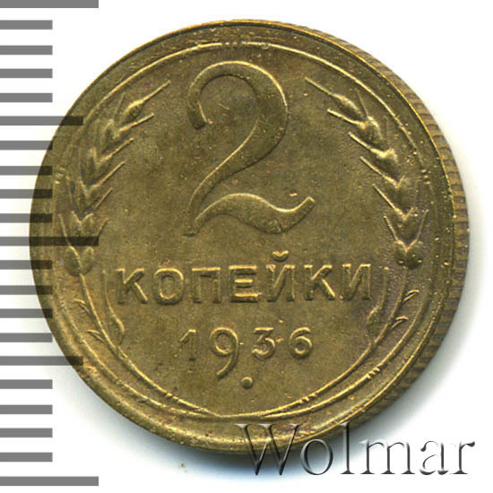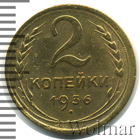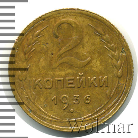 Двухкопеечные монеты, для денежного обращения СССР, чеканились на Ленинградском монетном дворе, из сплава алюминиевой бронзы, в период с 1926 по 1957 год. 2 копейки 1936 г. небольшая монета, весом в два грамма и диаметром 18 мм., желтого цвета. Цена на эту монету, в не высоком качестве, минимальна. В коллекционном состоянии UNC, представляет повешенных интерес для нумизматов (таких экземпляров крайне мало). Цена на такие две копейки 1936 г. может в 50 и более раз превосходить цену "потёртых" двушек этого же года. Различные сочетания сторон (см. описание аверса и реверса), дало нам 10 разновидностей. Три самых редких из них со шт. 1 (Г, В, Д).