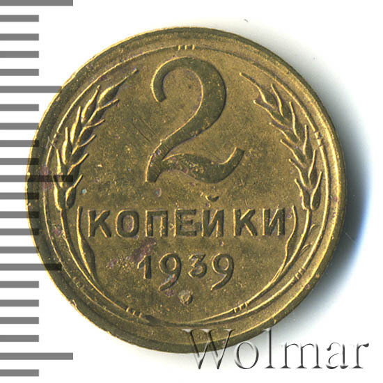 2 копейки 1939 г - рядовая монета, коллекционную привлекательность имеет только в превосходном состояния (без следов обращения, царапин, забоин и пятен, в штемпельном блеске). Чеканка велась из немагнитного бронзового сплава, жёлто – золотистого цвета. Тираж не известен. Соответствует типу 1935 – 1946 гг. Соостность (отношение аверса к реверсу) - медальная.