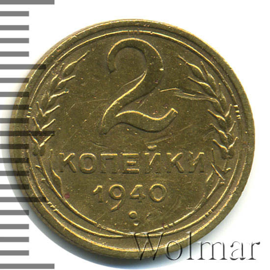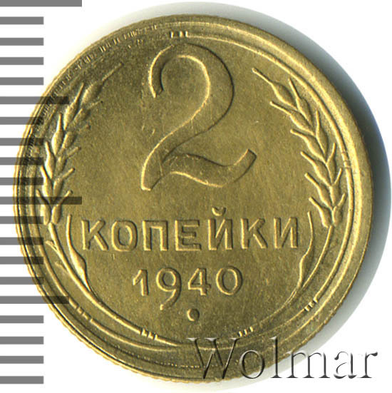 Предвоенный выпуск 2 копеек производился на Ленинградском монетном дворе. В 1940 году было отчеканено семь номиналов монет различного достоинства для денежного оборота Советского Союза. Чеканка, двух копеек, велась из немагнитного сплава алюминиевой бронзы, желтого цвета. Тип 1937 – 1946 гг. Соостность – 0 градусов, так называемая медальная (как и у всех монет СССР).