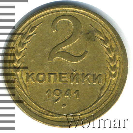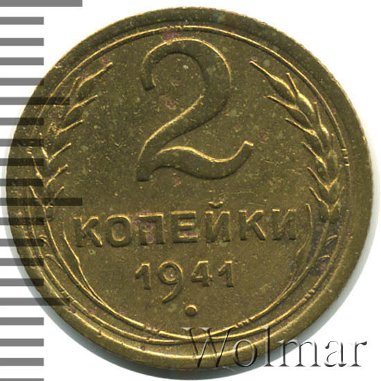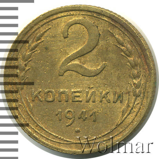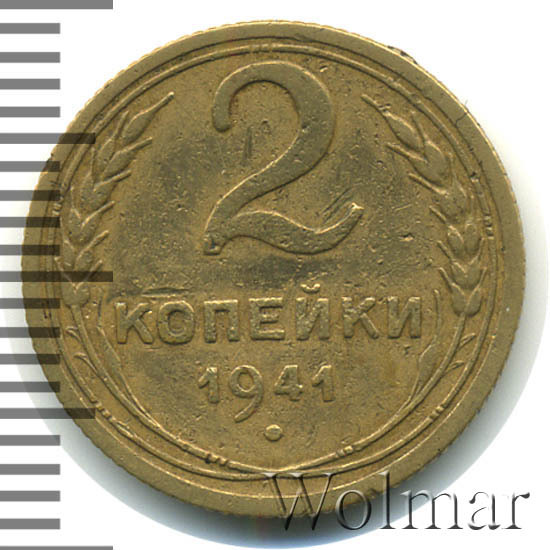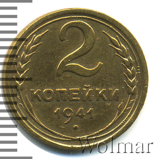 Две копейки 1941 г. – рядовая монета в погодовки разменной мелочи СССР. Эта монетка одна тысяча девятьсот сорок первого года, чеканились на Ленинградском монетном дворе из немагнитного бронзового сплава, золотисто – желтого цвета. Тираж доподлинно не известен. По весовым и геометрическим параметрам соответствует типу двухкопеечных монет, образца 1935 – 1946 гг. Отношение аверса к реверсу – медальное (0 градусов).