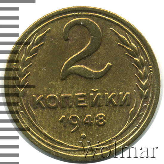 2 копейки 1948 года. Чеканилась из алюминиевой бронзы. Тип 1948 – 1957 годов.