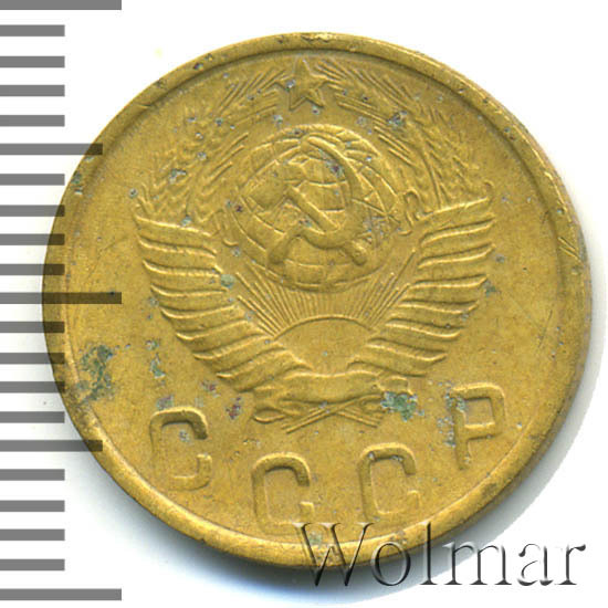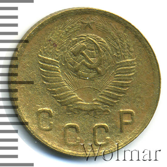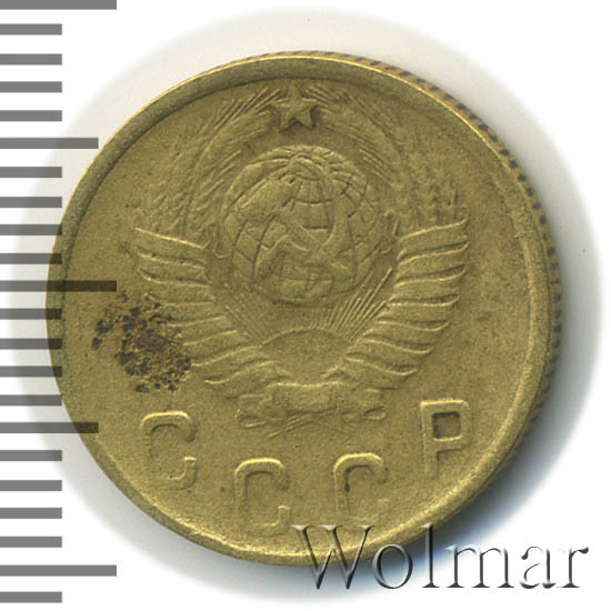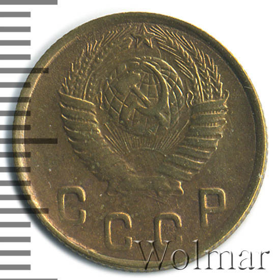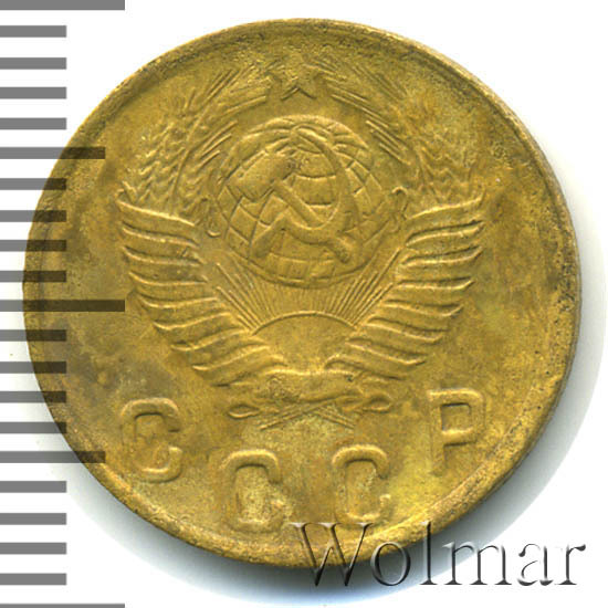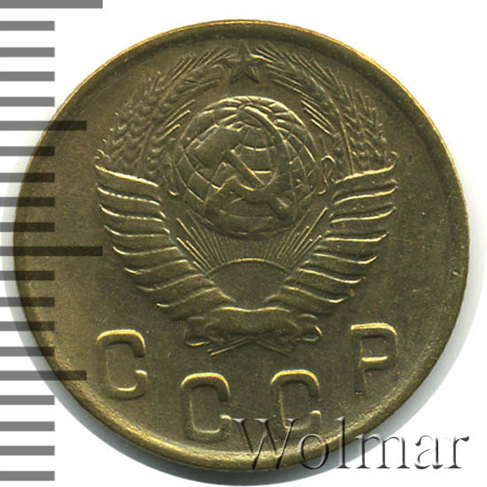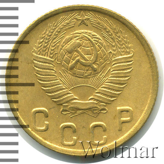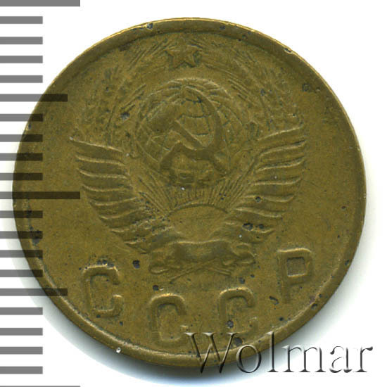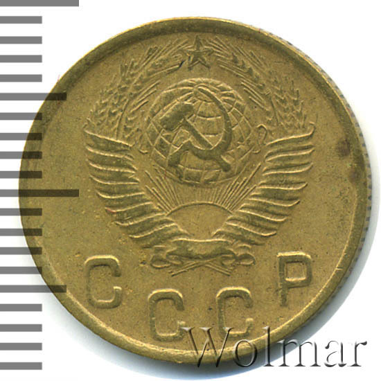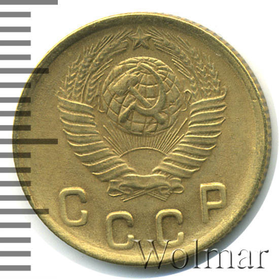 Две копейки 1949 г. - тиражная монета Советского Союза, один из 7 номиналов регулярного выпуска одна тысяча девятьсот сорок девятого года для денежного обращения СССР. Рядовая монета, коллекционную привлекательность имеет в состояния UNC (без следов обращения, царапин, забоин и пятен). Металл чеканки: алюминиевой - бронзовый сплав, жёлтого цвета, немагнитный. Тираж огромный, легко встречается в отличном состоянии. Цена 2 копеек 1949 г. не велика, за исключением красивых монет в превосходной сохранности, которые могут стоить в несколько раз дороже.