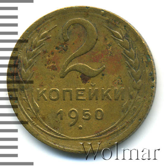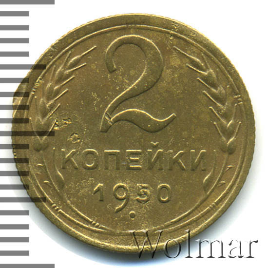 2 копейки 1950 – монета регулярного чекана, образца 1948 – 1957 годов. О приемлемой цене можно говорить только в сохранности UNC.