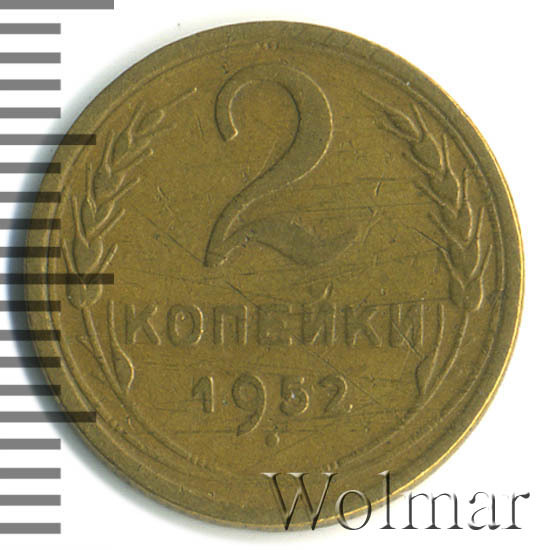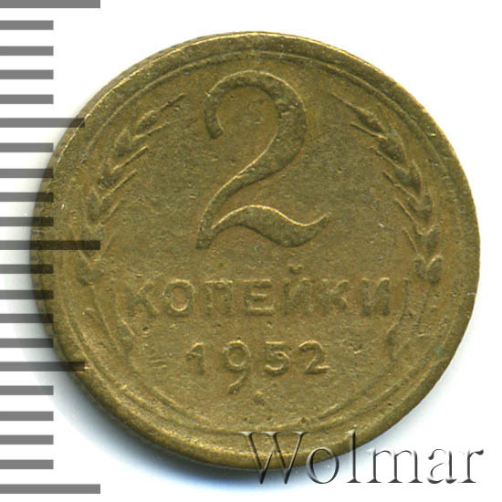Две копейки 1952 года - разменная монета, один из 7 номиналов регулярного чекана, выпущенных в этом году для денежного обращения Советского Союза. Расположение аверса к реверсу медальное - 0 градусов, чеканилась из сплава алюминия и бронзы, немагнитного, жёлтого цвета. Образца 1948 – 1957 годов. Чеканка Ленинградского монетного двора (сейчас СПМД, г. Санкт - Петербург). Разновидностей по сочетаниям штемпелей сторон монеты – нет.