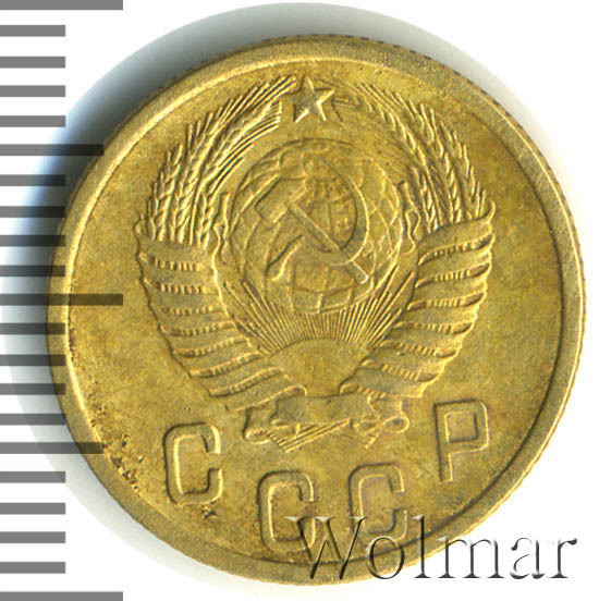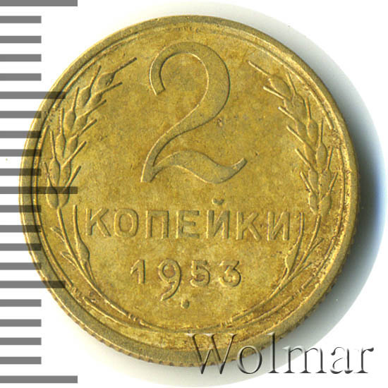 2 копейки 1953 - довольно частая монетка из алюминиевой бронзы. На лицевой стороне двушки изображен герб Советского Союза с 16 витками связующей ленты и прямоугольными буквами "СССР". Разновидностей сочетания штемпелей аверса/реверса не известно. Цена 2 копеек 1953 низкая, ввиду огромных тиражей выпуска, но точного количества отчеканенных монет не известно, поскольку подобные сведения считались государственной тайной. Стоимость частой советской мелочи обычно напрямую зависит от состояния оцениваемого экземпляра, наличия штемпельного блеска, красоты патины (естественного слоя окислов металла монеты).