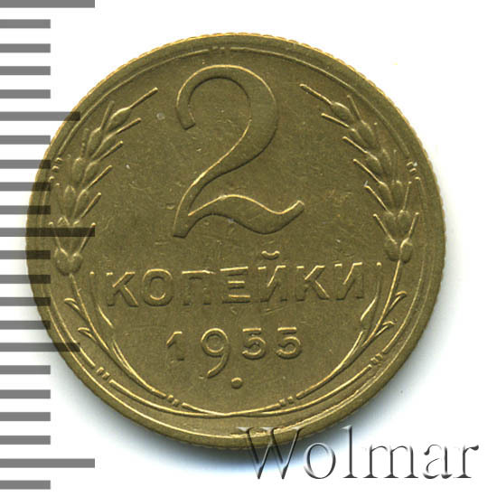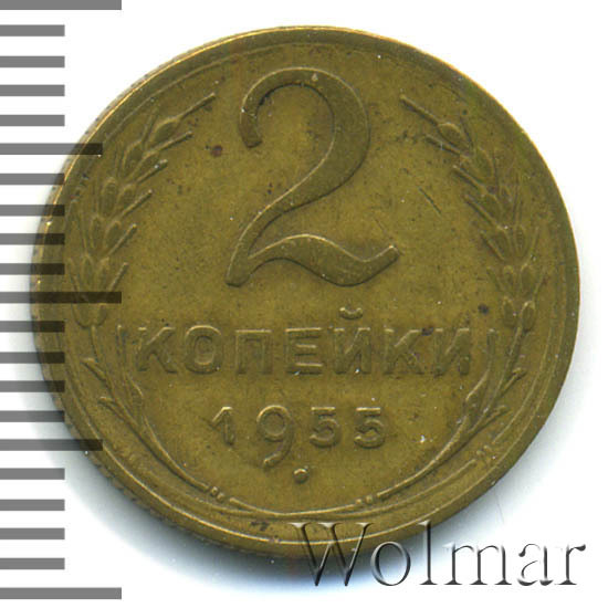 Двухкопеечная монета, тип 1948 – 1957 годов. В 1955 году, в оборот было выпущено семь различных номиналов (от 1 до 20 копеек). Отчеканена для денежного обращения СССР, на Ленинградском монетном дворе, из немагнитного сплава алюминиевой бронзы, желтого цвета. Соостность (отношение аверса к реверсу) медальная. Тираж 2 копейки 1955 г., по сегодняшний день, доподлинно не известен. Довольно частая, рядовая монета, коллекционную привлекательность имеет от состояния AU и выше.