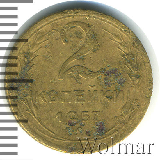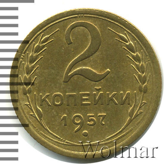 2 коп. 1957 г., тиражная монета денежного оборота Советского Союза. Отчеканена на Ленинградском монетном дворе, металл изготовления – немагнитная алюминиевая бронза. Известных разновидностей - две. С лицевым штемпелем 1.2 (Ф№103) превосходит стоимостью обычную (шт. 1.1) в 100 и более раз. Более подробно ознакомиться с ценой двух копеек 1957 г., Вы можете во вкладке «стоимость монет», а так же принять участие в текущих аукционах, заглянув во вкладку «активные лоты».