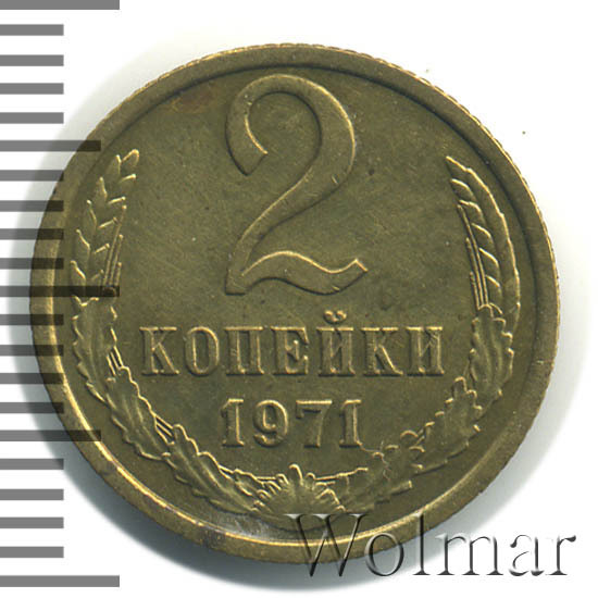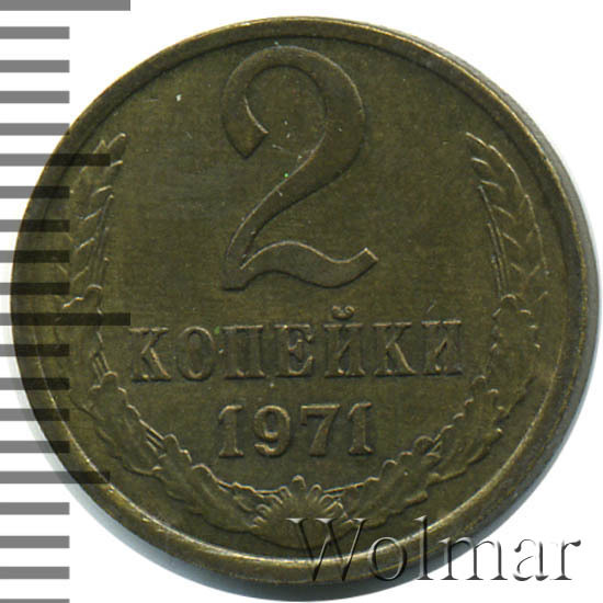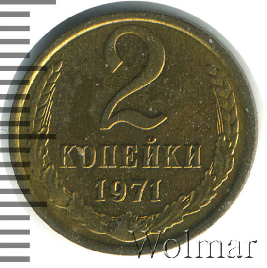 Тираж 2 коп. 1971 г. доподлинно неизвестен. Относится к типу 1961 – 1991 годов. Соотношение сторон монеты (отношение аверса к реверсу) медальное. Немагнитный медно – цинковый сплав, желтого цвета. Известных штемпельных разновидностей нет. Стоимость 2 копейка 1971 г. минимальна и сравнима с ценой аналогичных годовых двушек, произведённых огромными тиражами. Более подробно ознакомиться с ценой 2 копеек 1971 года, Вы можете во вкладке «стоимость монет», а так же принять участие в текущих аукционах, пройдя по вкладке «активные лоты».