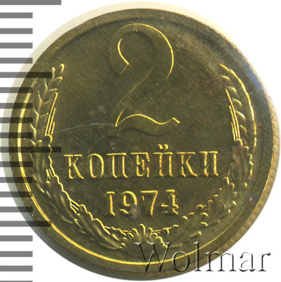 Рядовая, разменная монета, номиналом в 2 копейки. Отчеканена на Ленинградском монетном дворе (ныне СПМД, г. Санкт – Петербург) для денежного обращения Советского Союза. Тираж этой монетки был очень большой, в связи с чем цена 2 копеек 1974 года небольшая, в отличие от 20 коп. этого года. Даже экземпляры в сохранности UNC стоят совсем недорого. Изготавливалась из немагнитного латунного сплава, жёлтого цвета. Чеканилась как для обращения (обычного качества) и, улучшенного, для годовых наборов Госбанка СССР. Отношение аверса к реверсу 0 градусов (медальное).