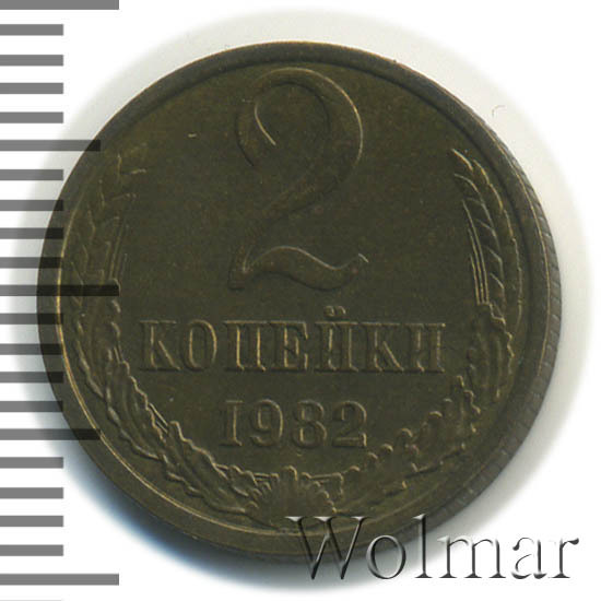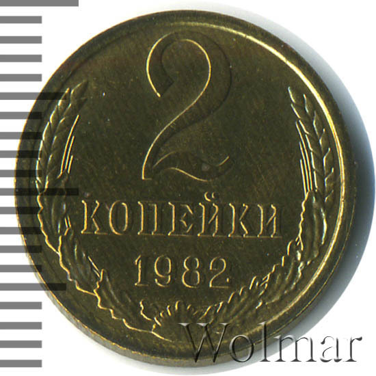 Двухкопеечная тиражная монета 1982 года чеканилась из сплава меди и цинка, а весила ровно 2 грамма. Цена 2 копеек из-за огромных объёмов выпуска, как говорят опытные коллекционеры, стремится к нулю. Даже монетка в идеальной сохранности с штемпельным блеском как выше на фото стоит чисто символическую цену. Известны две разновидности, различающиеся расстоянием от деталей рисунка аверса до гуртового ободка монеты. Несколько реже попадаются двушки с колосьями и цифрами номинала больше отдалёнными от края.