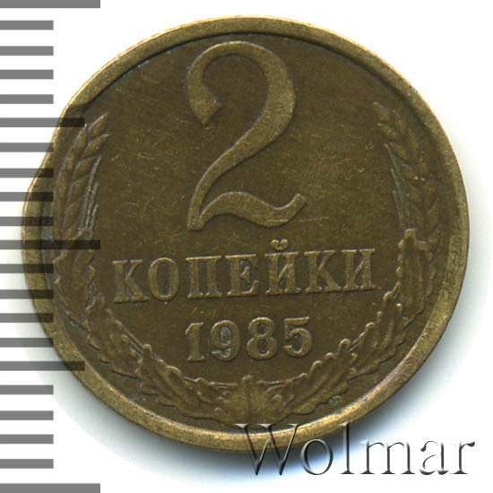 Известна одна разновидность этой рядовой монеты. 2 коп. 1985 г. Чеканились как для обращения, так и (улучшенного качества) для годовых наборов Государственного Банка СССР. Ниже приведены последние проходы и цены на самых популярных аукционах, по которым можно определись актуальную стоимость 2 копеек 1985 года.