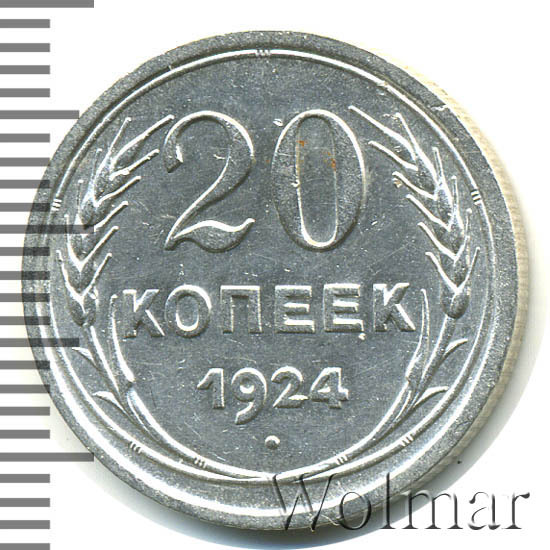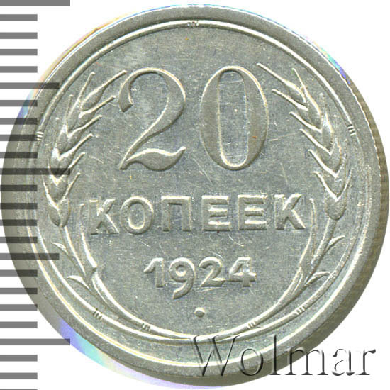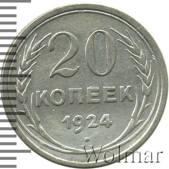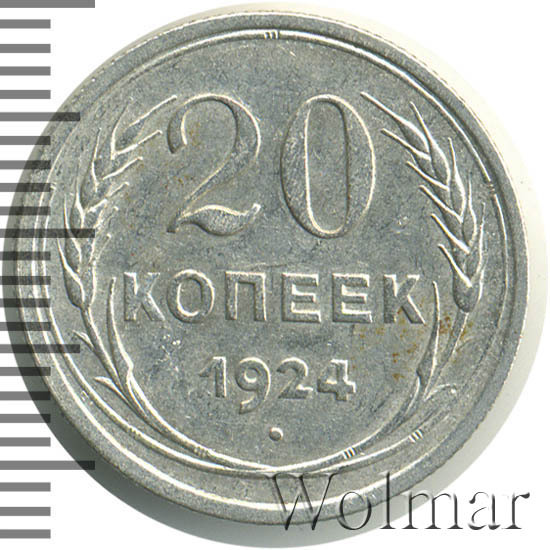 В 1924 году, начался выпуск медных и серебряных монет для денежного обращения недавно созданного (1922) союзного государства под названием Союз Советских Социалистических Республик. В обиход вошли номиналы: полкопейки (с 1925), 1,2,3,5 копеек, чеканка которых производилась в меди. 10, 15, 20 копеек (отчеканены в билоне) и пятьдесят копеек, один рубль – серебро 900 пробы. Двадцать копеек 1924 года, разменная, тиражная монета. Чеканка велась на Ленинградском монетном дворе. Имеет три разновидности. Самая значимая из них – "перепутка" с аверсом от 1 коп. двадцать четвертого года (Ф№9), отличающиеся по цене от обычной в несколько сот раз. Также была выполнена в специальном (полированном) чекане (Ф№8П). В обращении не встречаются. Цена на них превосходит стоимость дорогой разновидности двадцати копеек 1924 г.