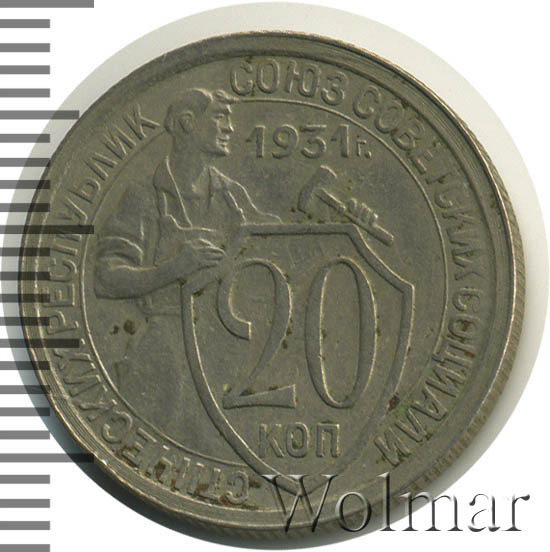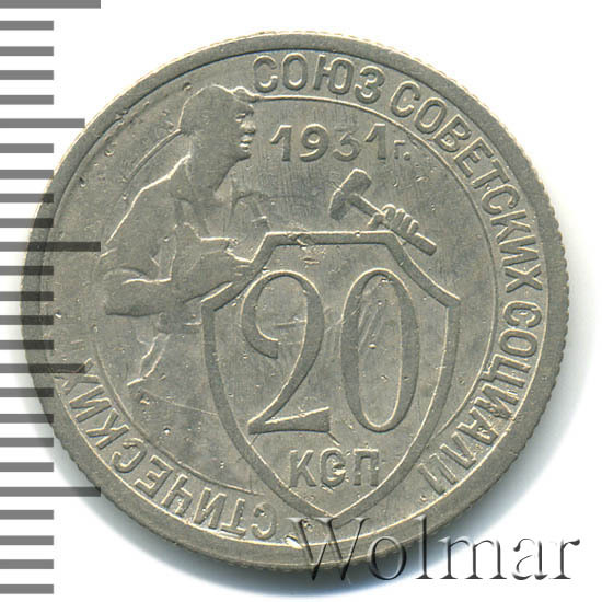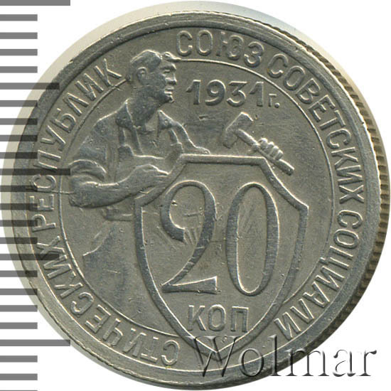 Дело в том, что монетное производство поглощало много серебра, в 1931 году, экономя драгоценные металлы, было принято решение отказался от производства серебряной монеты и приступить к выпуску 10, 15 и 20 копеек из похожего по весу и цвету, но значительно более дешёвого сплава - мельхиора. Были изготовлены новые штемпеля лицевой и оборотной стороны. Лицевая сторона этих монет осталась почти такой же, как и у старых серебряных, а на реверсе появилось изображение рабочего с молотом в руке, опирающегося на щит с обозначением номинала, и полное (не сокращённое, как прежде) название страны («Союз Советских Социалистических Республик» вместо «СССР»). 20 копеек 1931г из серебра считается раритетом.