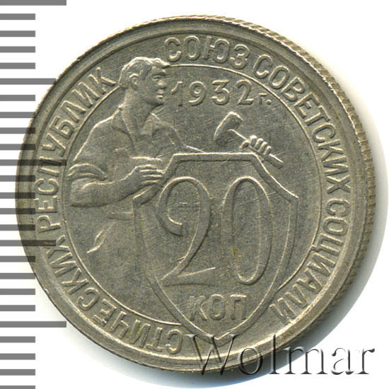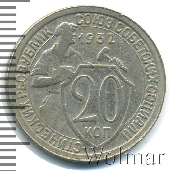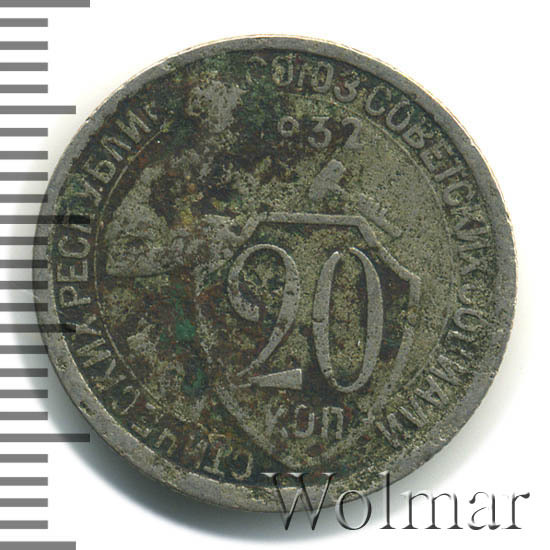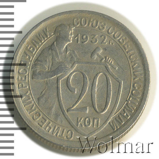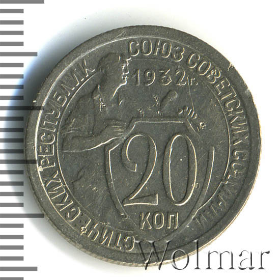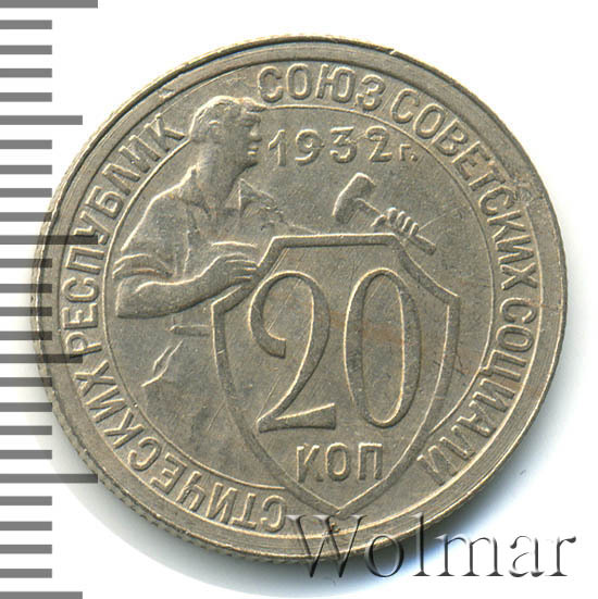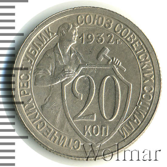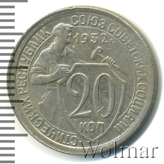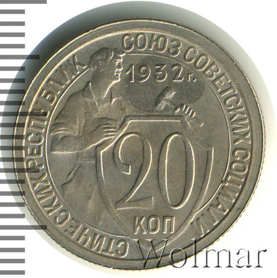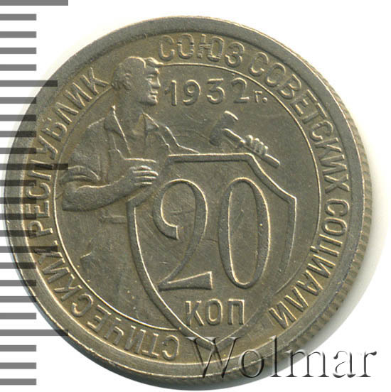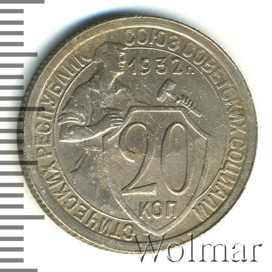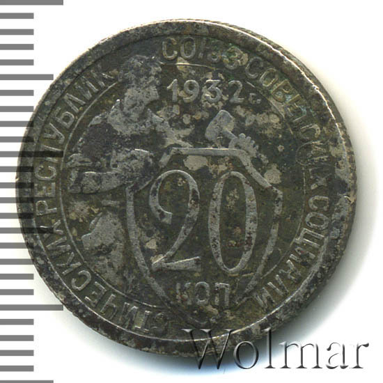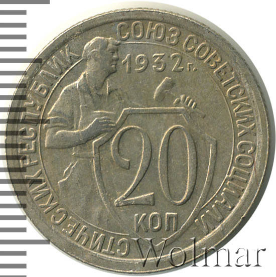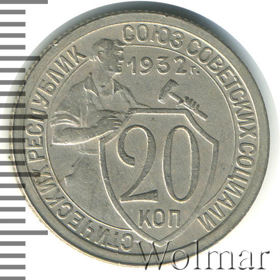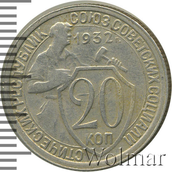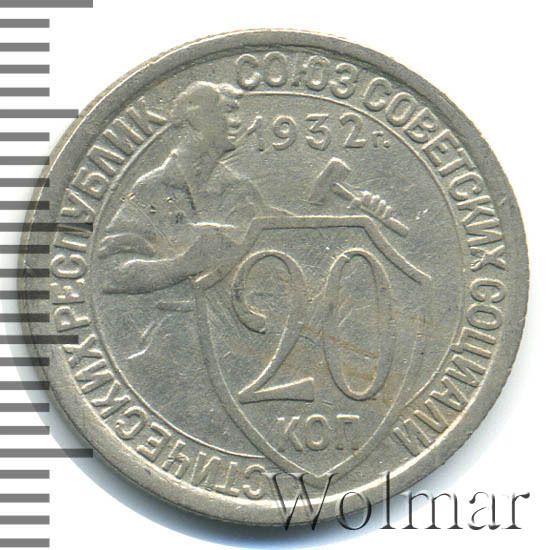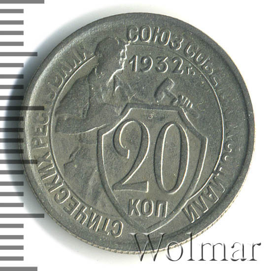 Цена 20 копеек 1932г. из мельхиора не велика, монета считается достаточно распространённой. Известны несколько разновидностей, различающиеся толщиной и рисунком цифр номинала; количеством и длиной остей колосьев в государственном гербе.
