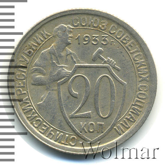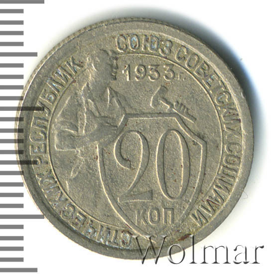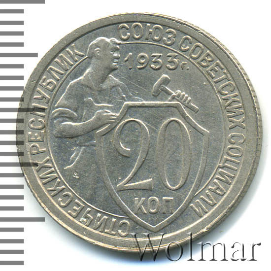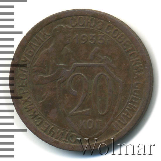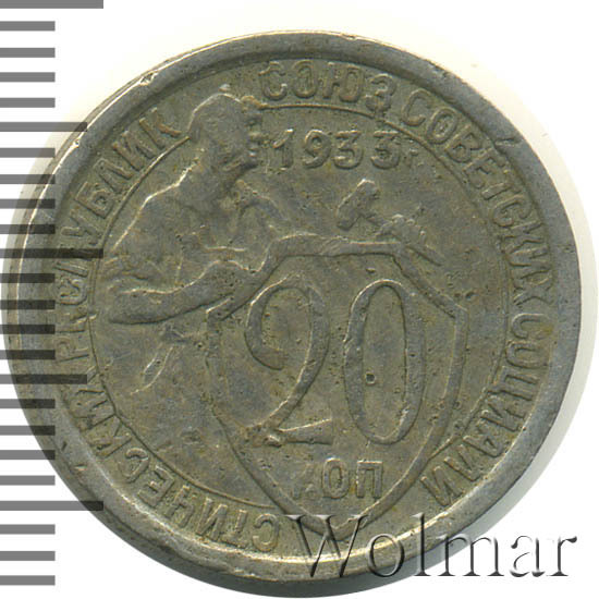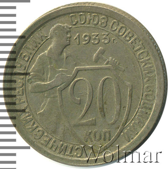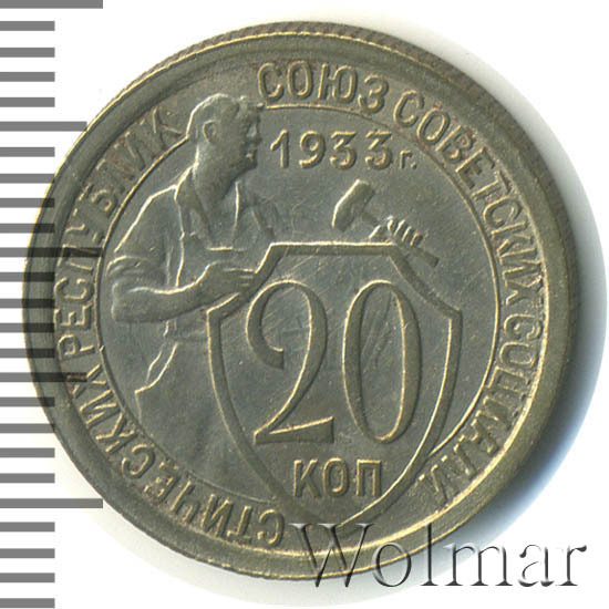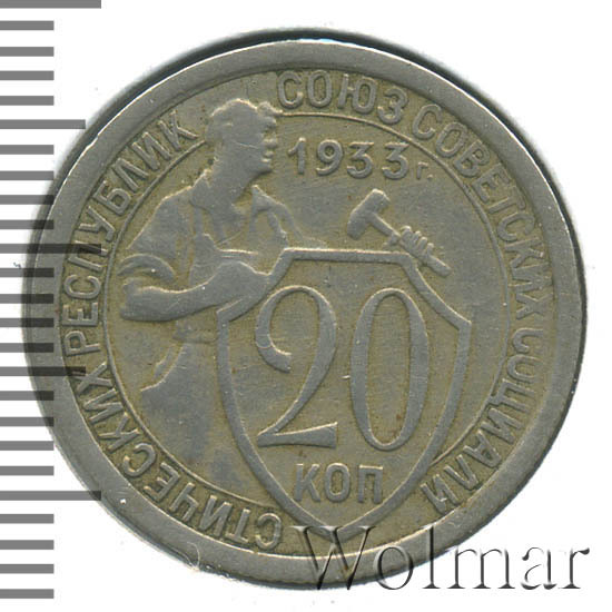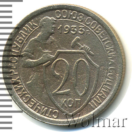Цена 20 копеек 1933г. не велика, монета считается довольно рядовой и частой. Известна более дорогая разновидность - новодельный чекан 50-х годов, выпущенный специально для нумизматов, в обороте не встречался.