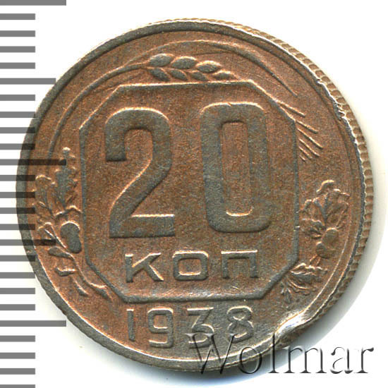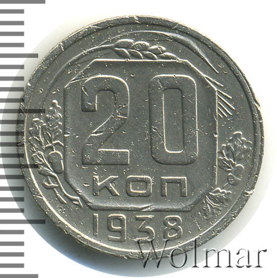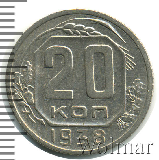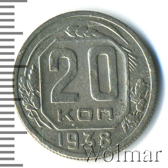 Двадцать копеек 1938 г. - рядовая, тиражная монета, отчеканена на Ленинградском монетном дворе. Один из 7 номиналов, выпущенных на ЛМД в денежное обращение в 1938 году. Материал для чеканки – немагнитный сплав мельхиор, белого цвета. Соостность (отношения аверса к реверсу) – медальная. Тип 1937 – 1946 гг. (в гербе 11 витков ленты). Тираж, до сегодняшнего дня, доподлинно не известен. Цена 20 коп. 1938 г. разнится, в зависимости от состояния. В отличном качестве UNC (без следов обращения, пятен, в штемпельном блеске) возрастает в несколько раз.
