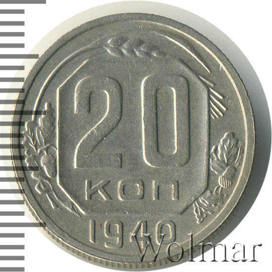 В сороковом году прошлого двадцатого века, монеты для денежного обращения Советского Союза, чеканились на Ленинградском монетном дворе (ныне СПМД, г. Санкт – Петербург). Рядовая, массовая монета, от этого цена 20 коп. 1940 не большая. Представляет коллекционную ценность только в отличной коллекционной сохранности UNC. В таком качестве, цена 20 копеек 1940 г., увеличивается в несколько раз.