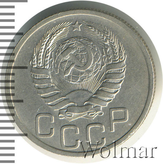 Чеканка, этой монеты, велась из немагнитного сплава меди с никелем (мельхиор), белого цвета. Тираж доподлинно не известен по сегодняшний день. Дизайн, весовые и геометрические параметры, соответствуют типу 1937 - 1946 гг. (в гербе 11 витков связующей ленты). Отношение сторон монеты друг к другу (0 градусов) - медальное.