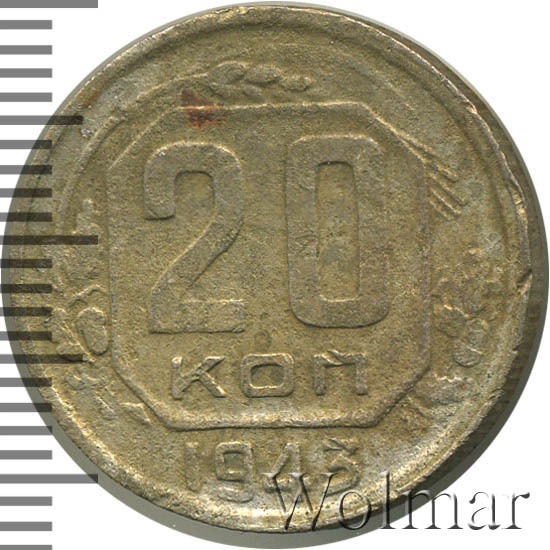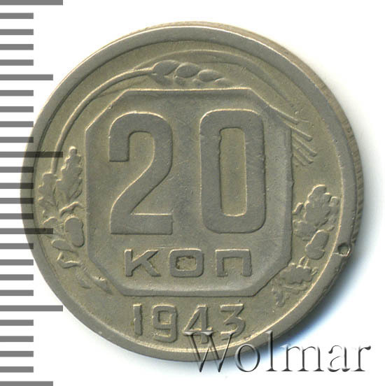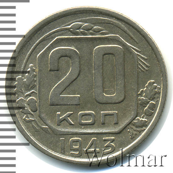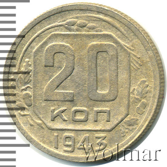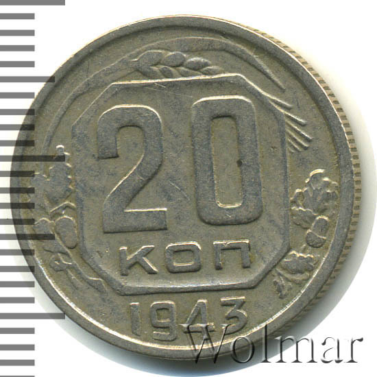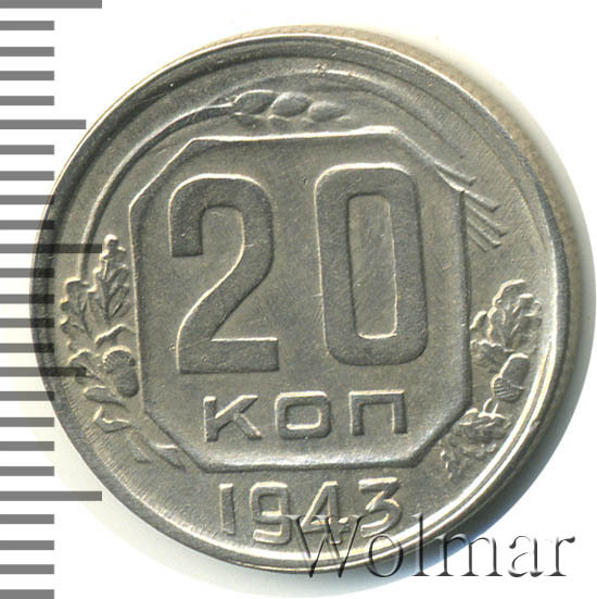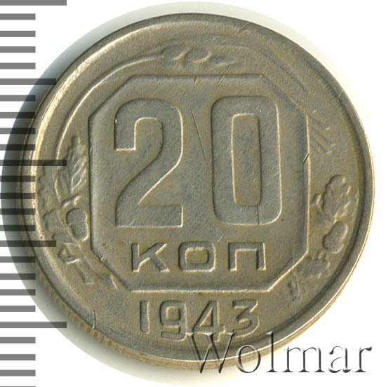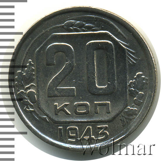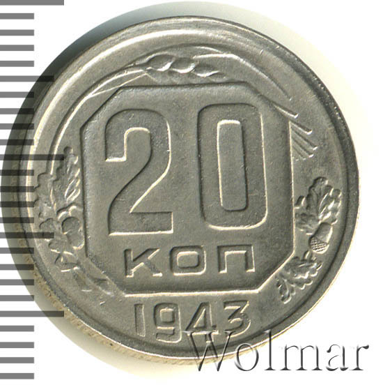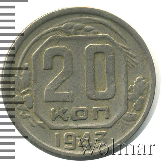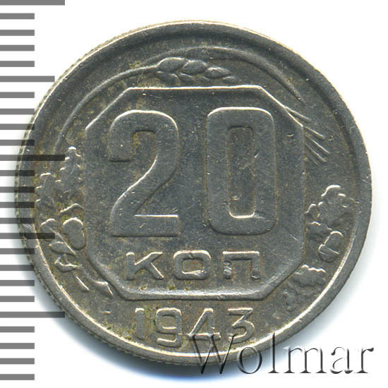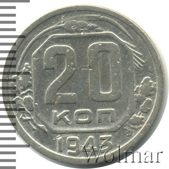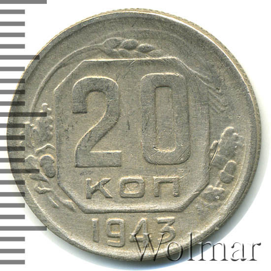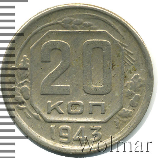 20 копеек 1943 года – разменная монета денежного обращения Страны Советов. Краснокамский монетный двор. В этом году было выпущено всего пять номиналов (3,5,10,15 и двадцать копеек). Материал для чеканки – мельхиор, белого цвета. Соосность – медальная (аверс к реверсу- 0 градусов). Тип 1935 – 1946 гг. (в гербе 11 витков связующей ленты). Известны двенадцать разновидностей, всевозможных деталей изображения как гербовой, так и оборотной стороны и их сочетаний. Связано, такое количество разновидов, с сильным износом рабочих штемпелей и постоянной их починкой и подработкой. Самые редкие из них: шт. 1.13В, шт. 1.23А и с лицевой стороной от трёх копеек 1937г. (Ф№64). Цены на них разнятся, в зависимости от состояния. Хотя, даже в среднем качестве, стоимость этих редких монет в разы больше остальных, наиболее часто встречающихся разновидностей 20 коп. 1943 года. В пятидесятые годы, на ЛМД, был произведён новодельный выпуск этой монеты со шт. 1.21А*(Ф№65Н). Новоделы не были пущены в оборот. Цену на двадцать копеек 1943 г., в различном коллекционном состоянии, Вы можете увидеть на странице ниже, где приведены статистические данные, построенные на основе прошедших аукционов на самых популярных площадках.