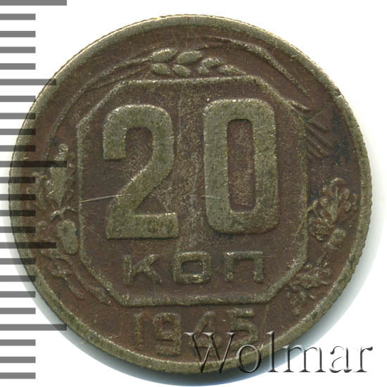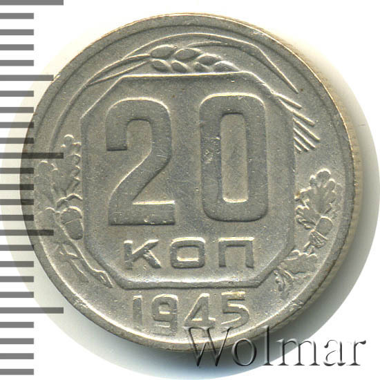 Реверс монеты 20 копеек 1945 года
