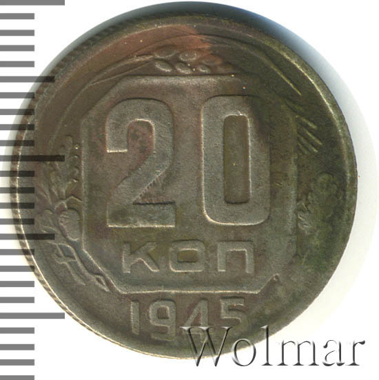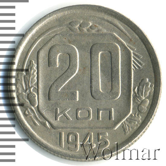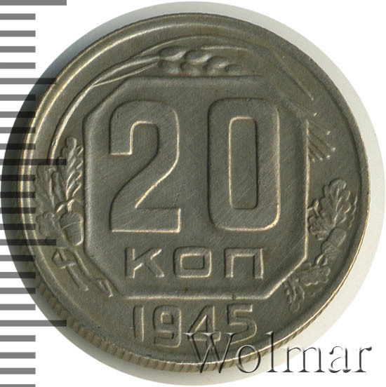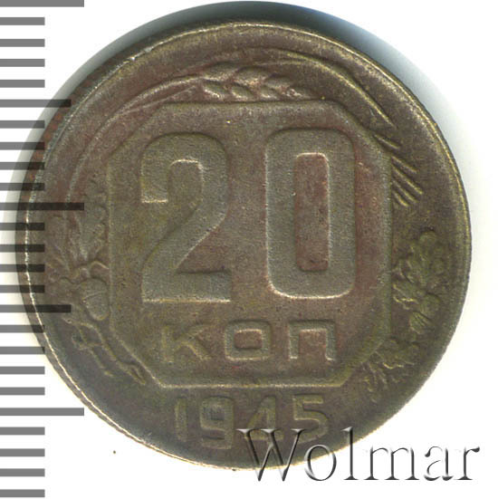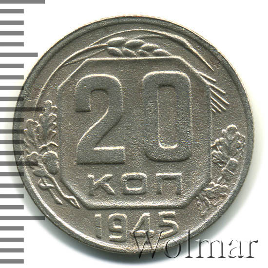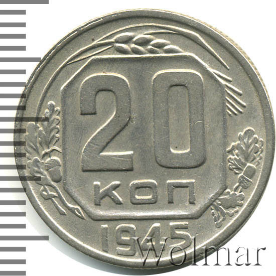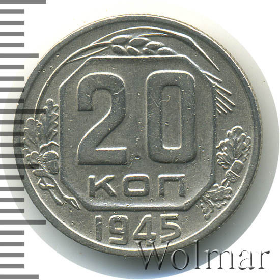 20 копеек 1945 года - немагнитная тиражная монетка из мельхиора. Двугривенник не считается редким. Известна единственная не очень частая разновидность, на реверсе которой цифры даты сближены вместе. Более детально разобраться в разновидностях и ознакомиться с со стоимостью 20 копеек 1945 года вы сможете на страницах нашего каталога, составленного по результатам торгов самых популярных нумизматических интернет-аукционов.