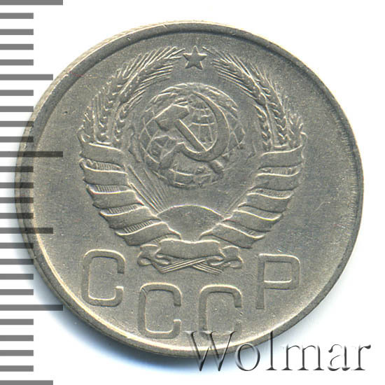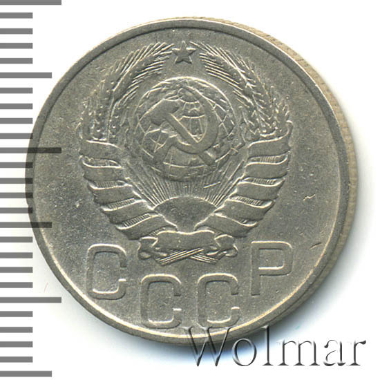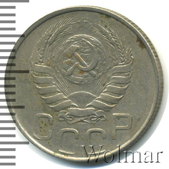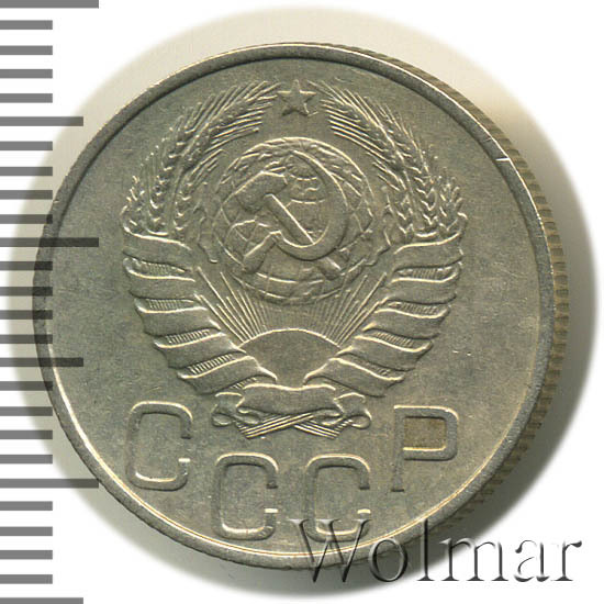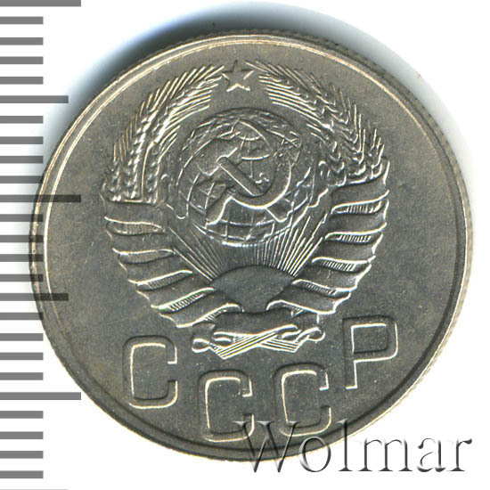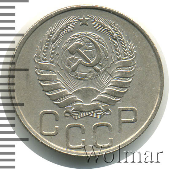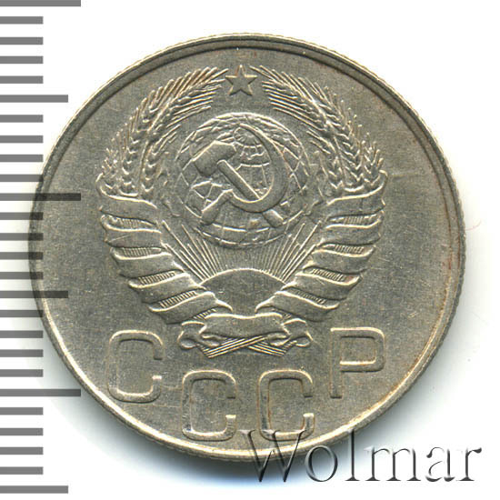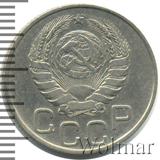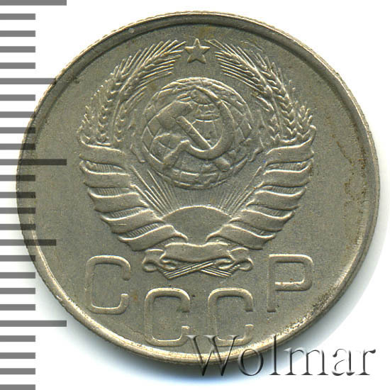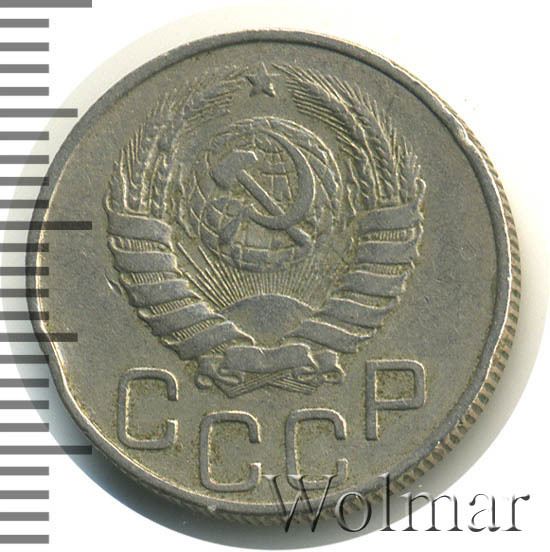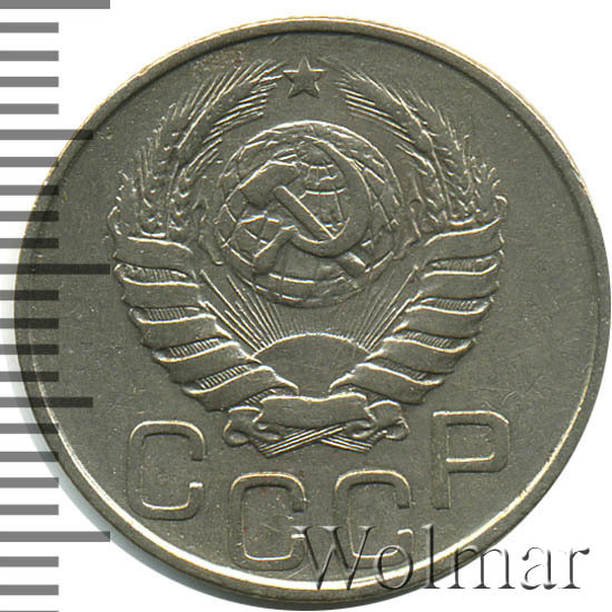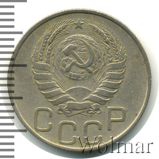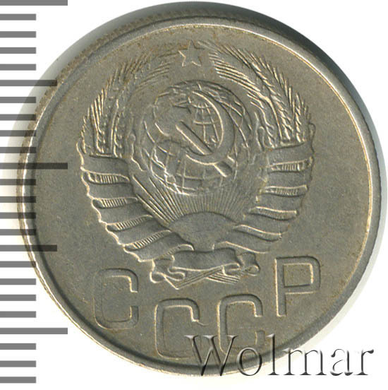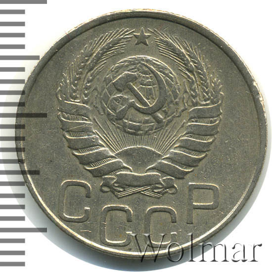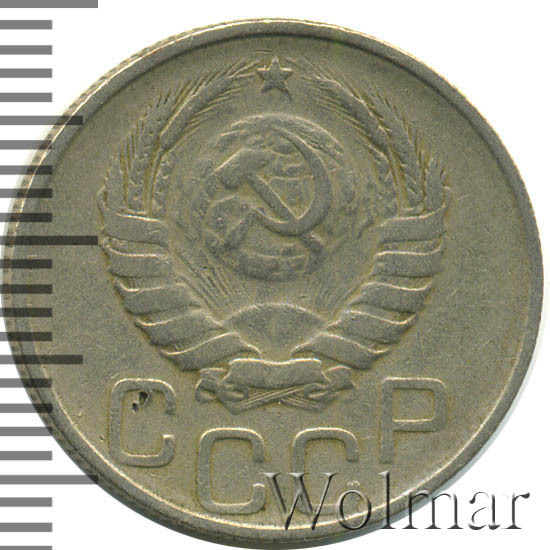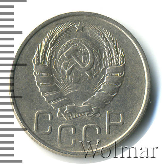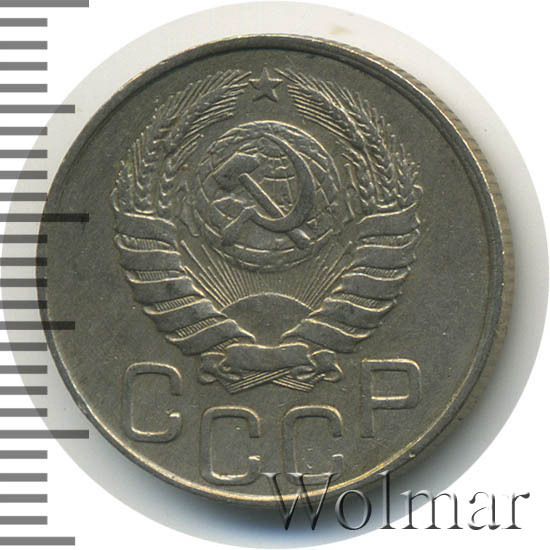 Один из 7 номиналов, выпущенных в обращение. Материал для чеканки – мельхиор, белого цвета. Соостность (отношения аверса к реверсу) – медальная. Тип 1935 – 1946 гг. (в гербе 11 витков ленты). Рядовая, массово встречаемая монета, от этого цена на неё не большая. Представляет коллекционную ценность только в сохранности UNC.