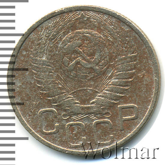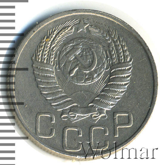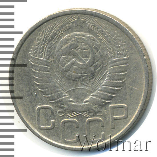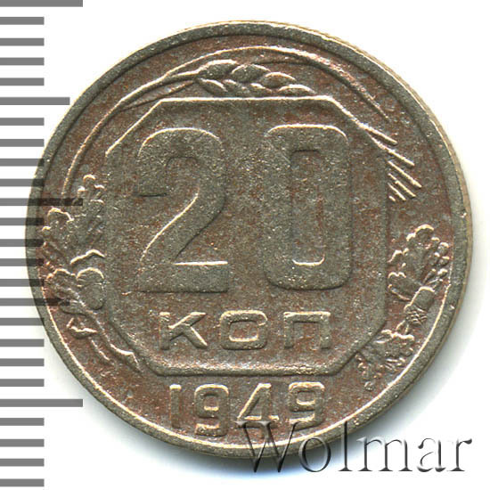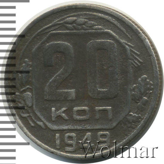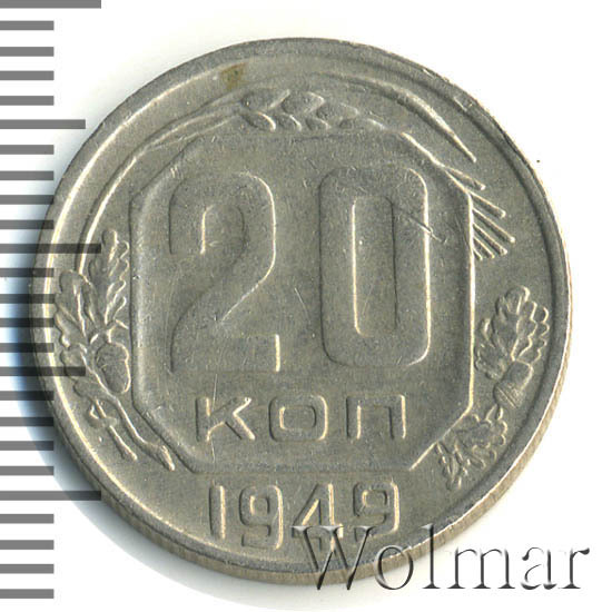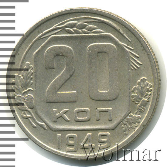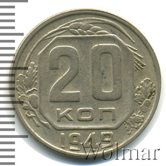 На 20 копейках 1949 года в гербе изображено 16 витков связующей ленты, по числу союзных республик, входивших на тот момент в состав Советского Союза. Симпатичные двугривенники чеканили из мельхиора - немагнитного сплава белого цвета. Известны четыре штемпельные разновидности. Самой редкой и дорогой считаются 20 копеек с лицевым штампом от 3-х копеек 1948 с выпуклой, гранёной и окантованной звездой, венчающей земной шар. (шт.2.1) Также существует два варианта расстановки цифр даты, подороже оцениваются монеты, у которых цифры раставлены шире, а "4" маленькая.