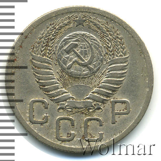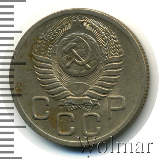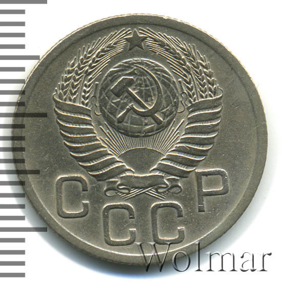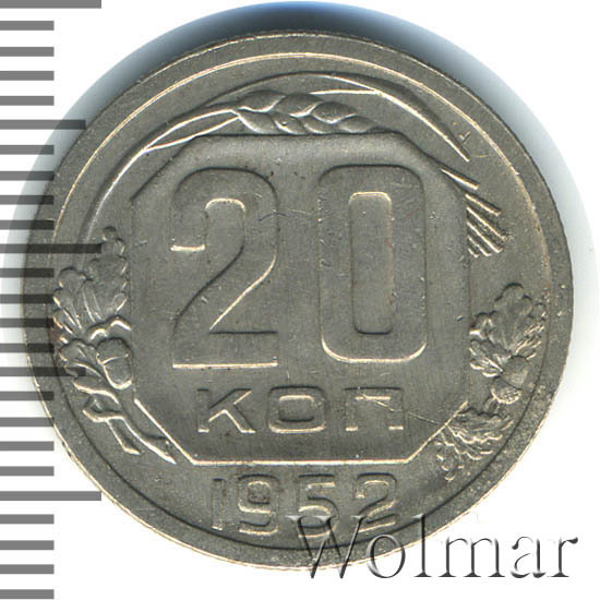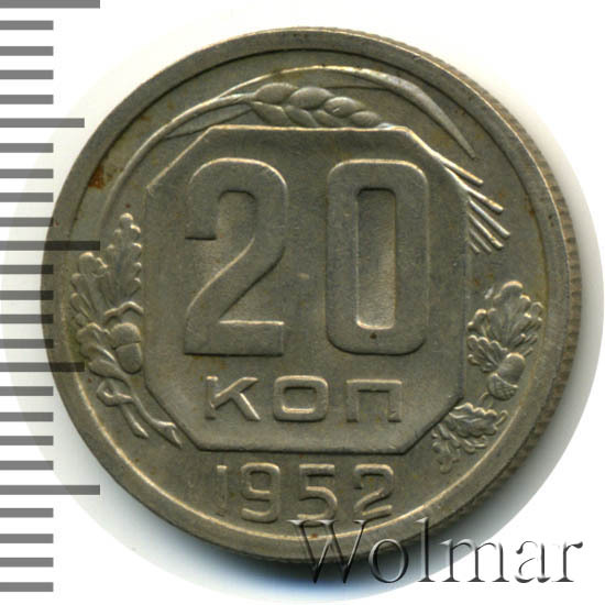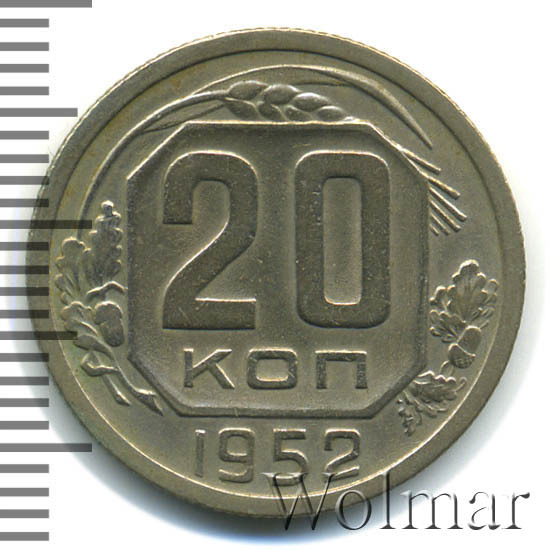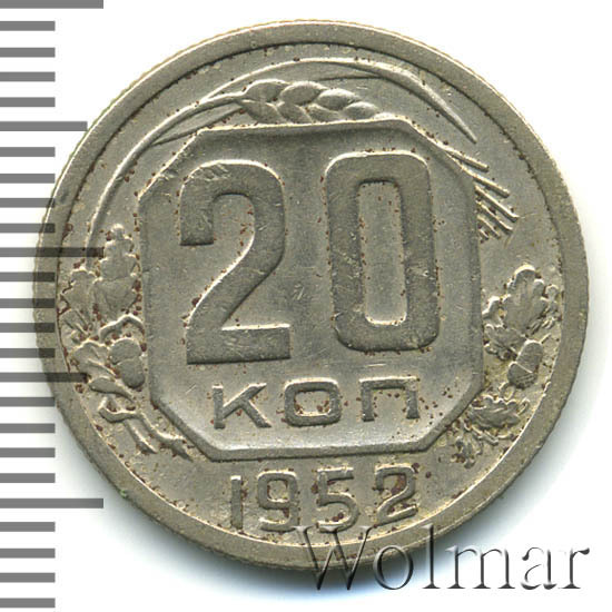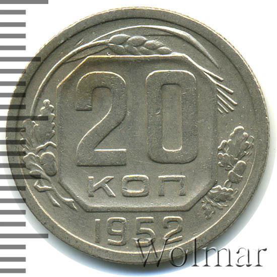 Тиражная, рядовая монета для денежного обращения Советского Союза, номиналом в двадцать копеек. Отчеканена 20 копеек 1952 г., как и остальные номиналы этого года, на Ленинградском монетном дворе. Материал чеканки – мельхиор, немагнитный сплав, белого цвета. Штемпельных разновидностей – две, равнозначные по цене и встречаемости.