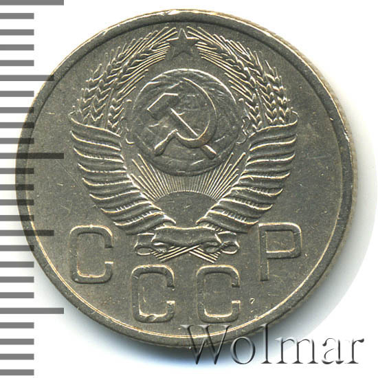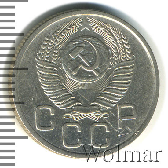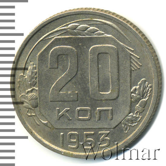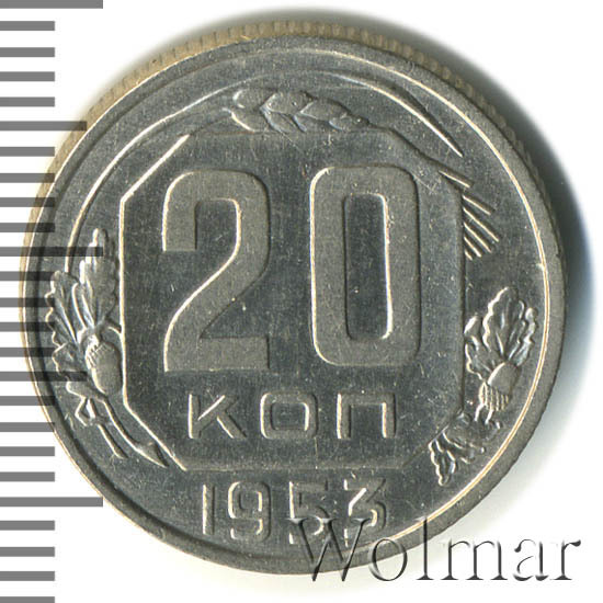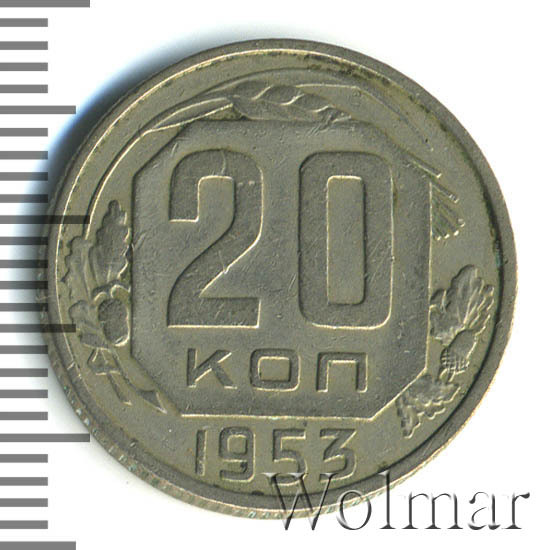 20 копеек 1953 года чеканили из мельхиора, сплава меди никеля и цинка. Известны три штемпельные разновидности в оформлении лицевой стороны. Раритетом считается двугривенник с приподнятой буквой "Р", с плоской поверхностью витков ленты в гербе. Простая монета (шт. 4.3.) встречается довольно часто, по этому её стоимость не велика. Подробнее узнать цену 20 копеек 1953 вам поможет наш каталог, составленный по результатам торгов на самых известных нумизматических интернет-аукционах.